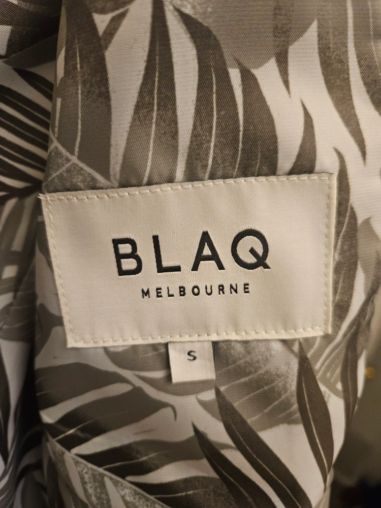 Selling a BLAQ Melbourne blazer in size small! It's a stylish piece with a unique leaf-patterned lining. The blazer is in great condition and ready for a new home