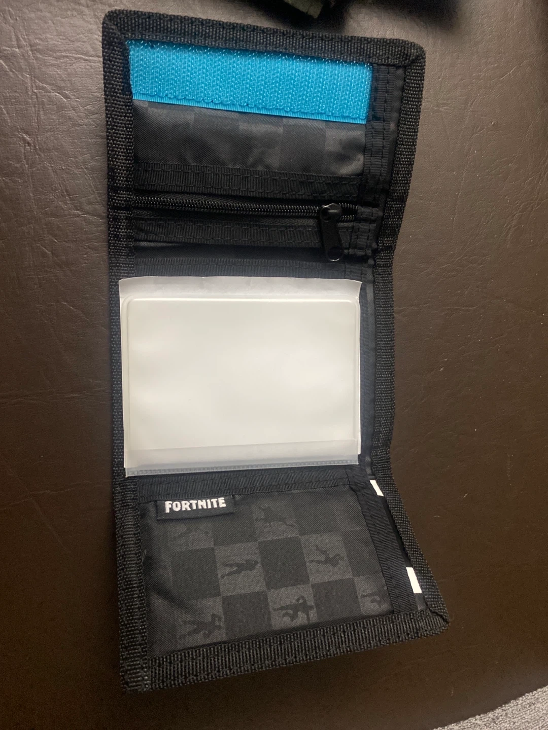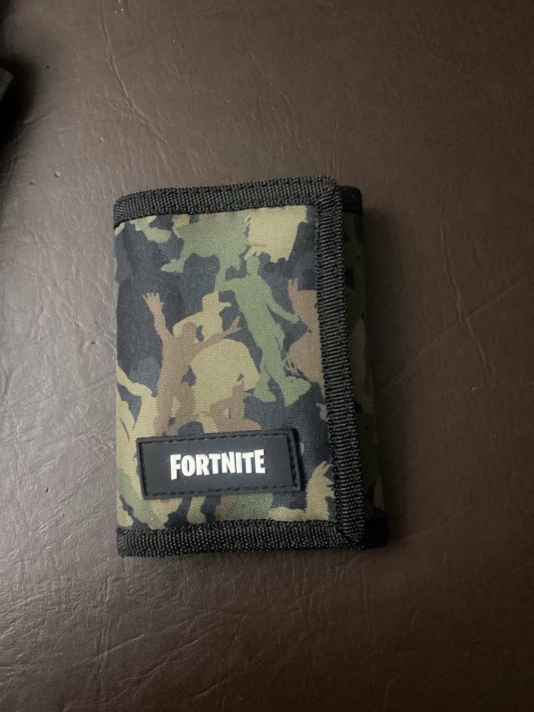 This is a Fortnite trifold wallet with a camouflage design. It includes multiple card slots and a zippered coin pocket. Great for kids who love the game!