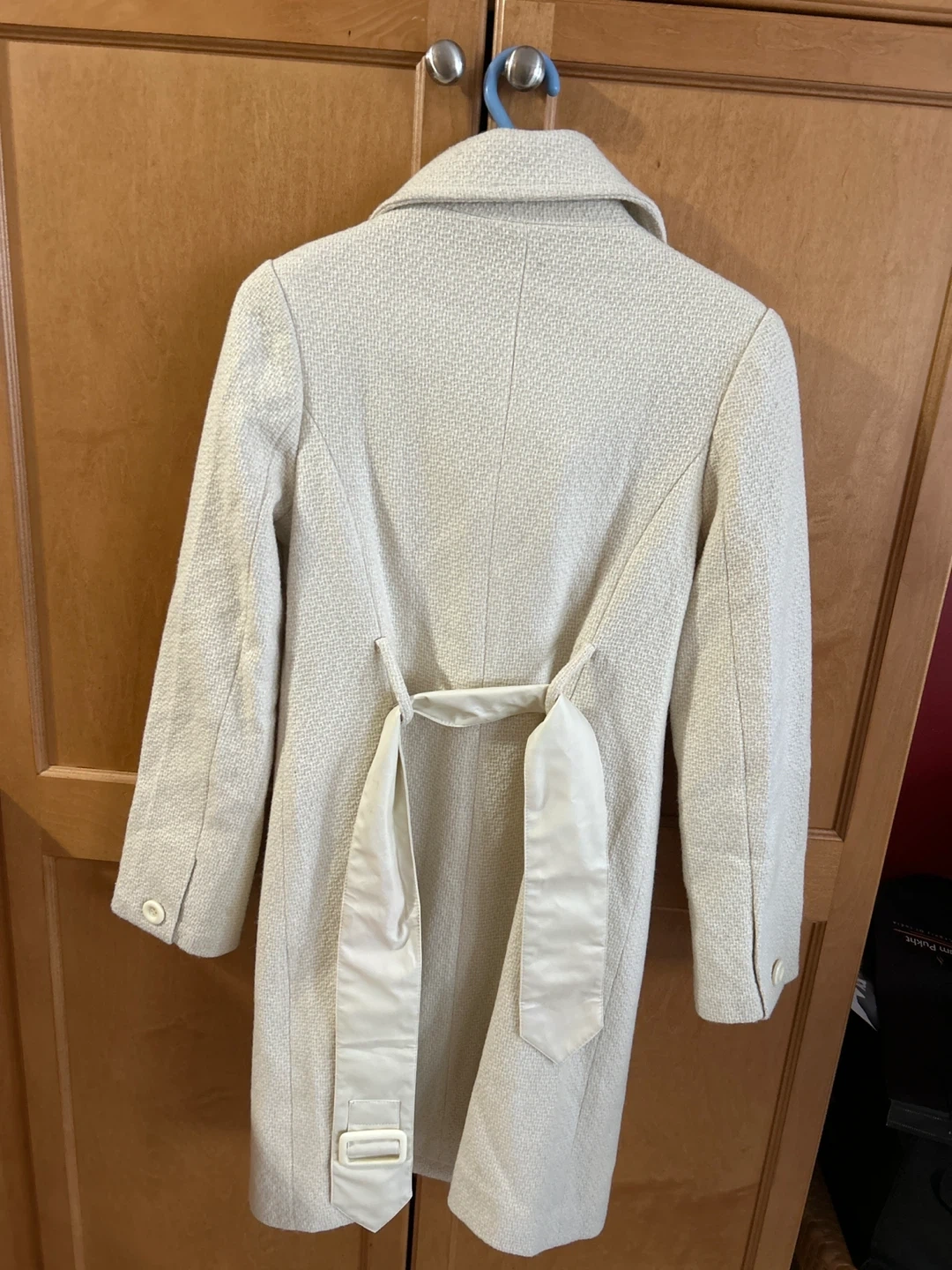 Here's a lovely beige women's coat! It features a double-breasted button design and a tie at the back for a flattering fit. It's in great condition and perfect for adding a touch of elegance to your wardrobe
