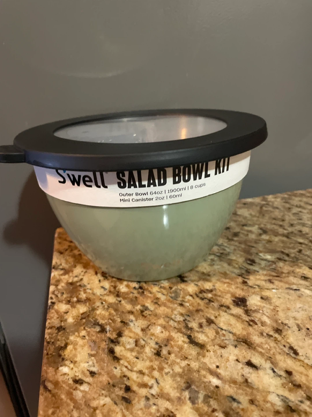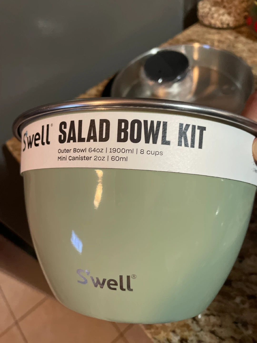 This S'well Salad Bowl Kit includes an outer bowl and a mini canister. The outer bowl is 64oz (1900ml) and holds 8 cups. The mini canister is 2oz (60ml). It's great for taking lunches on the go!