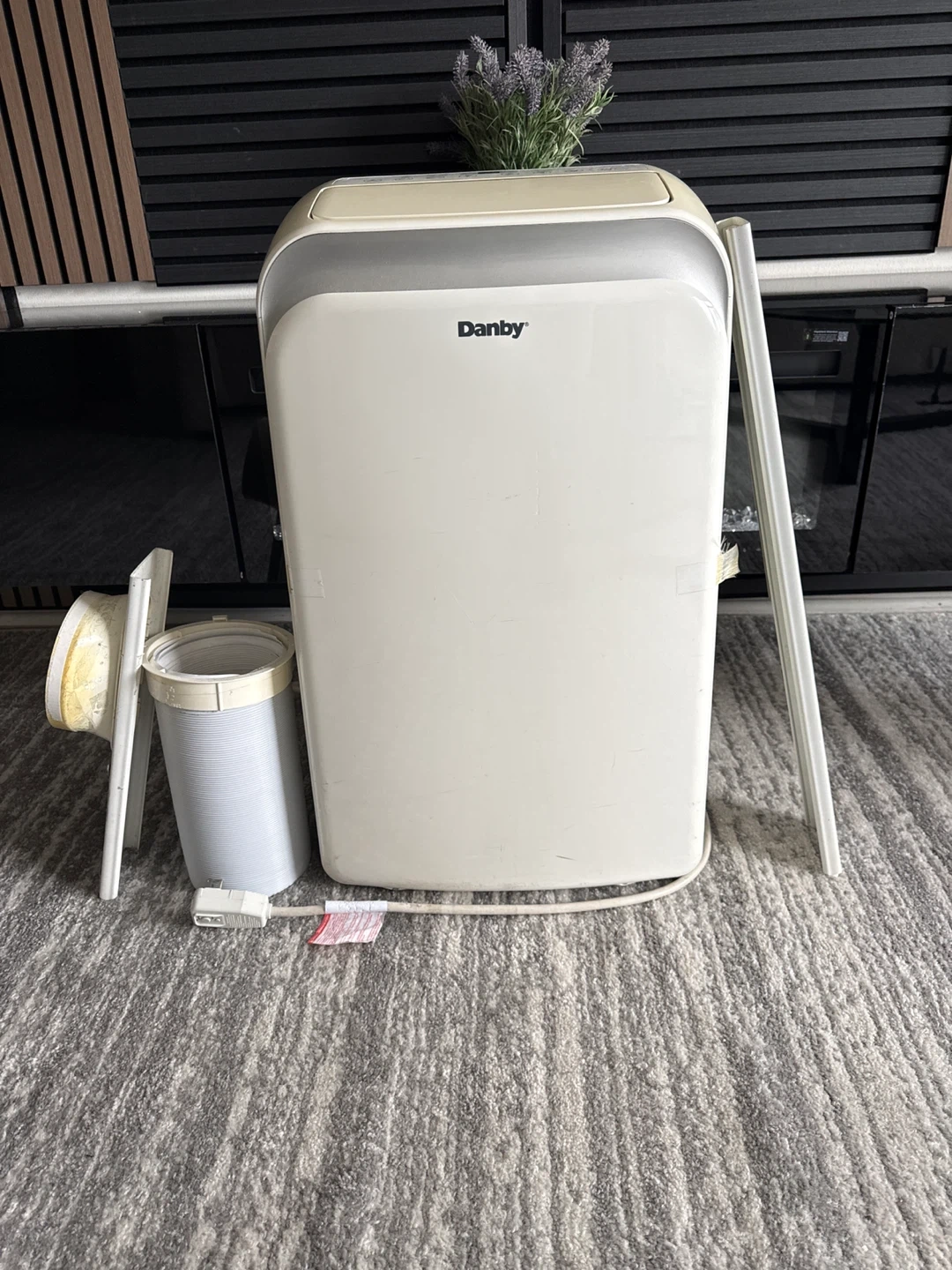 Danby portable air conditioner with window kit. It's a cream and grey unit. Includes the flexible exhaust hose and window attachment.