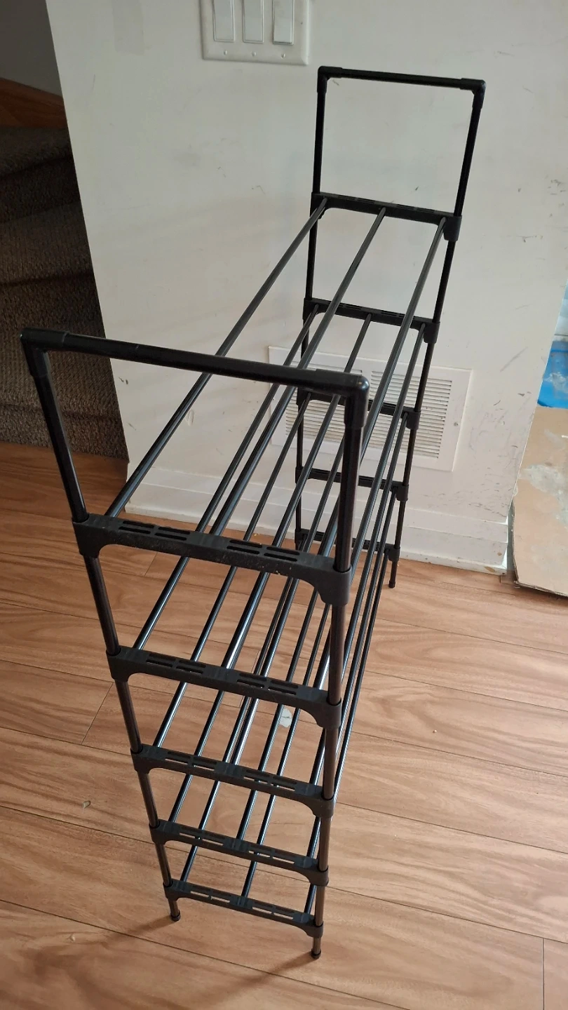 This is a black, 5-tier shoe rack. It's made of metal tubes and plastic connectors. It's a handy way to store your footwear!