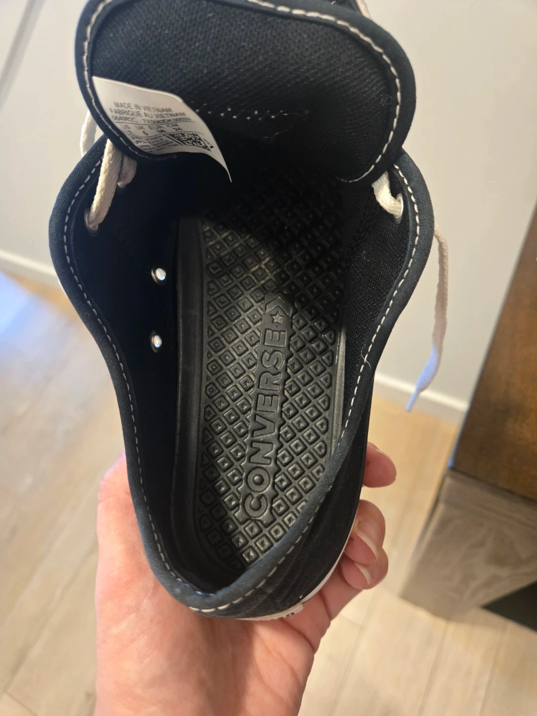 Classic Converse All Star low top sneakers in black canvas. Women's US size 7. These shoes feature a rubber toe cap and a durable rubber sole. Excellent condition.