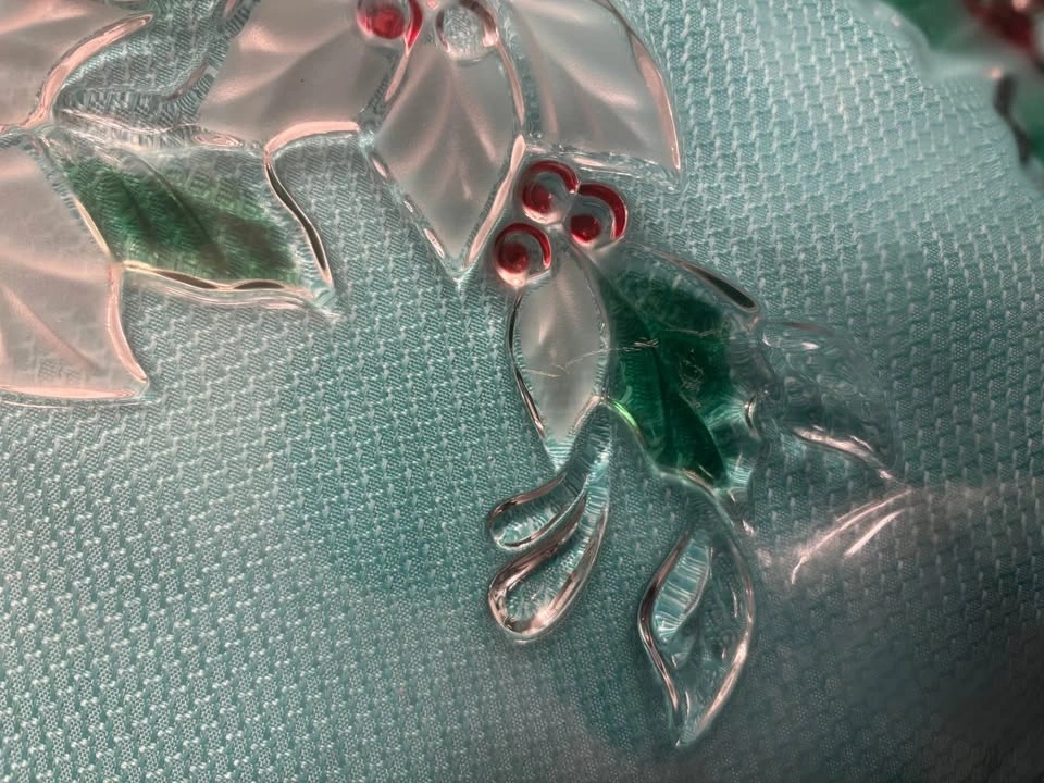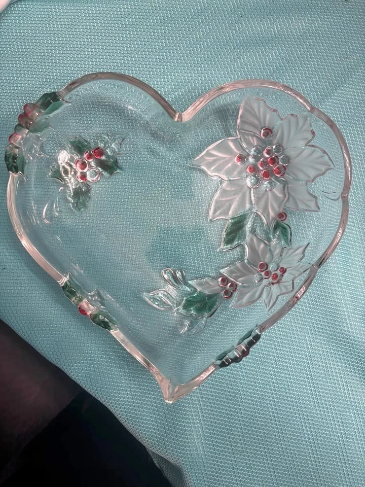 Beautiful Mikasa Holiday Bloom Poinsettia Crystal Heart Bowl. Good condition, with some barely visible scratches shown in the last picture. Pick up in Keswick.