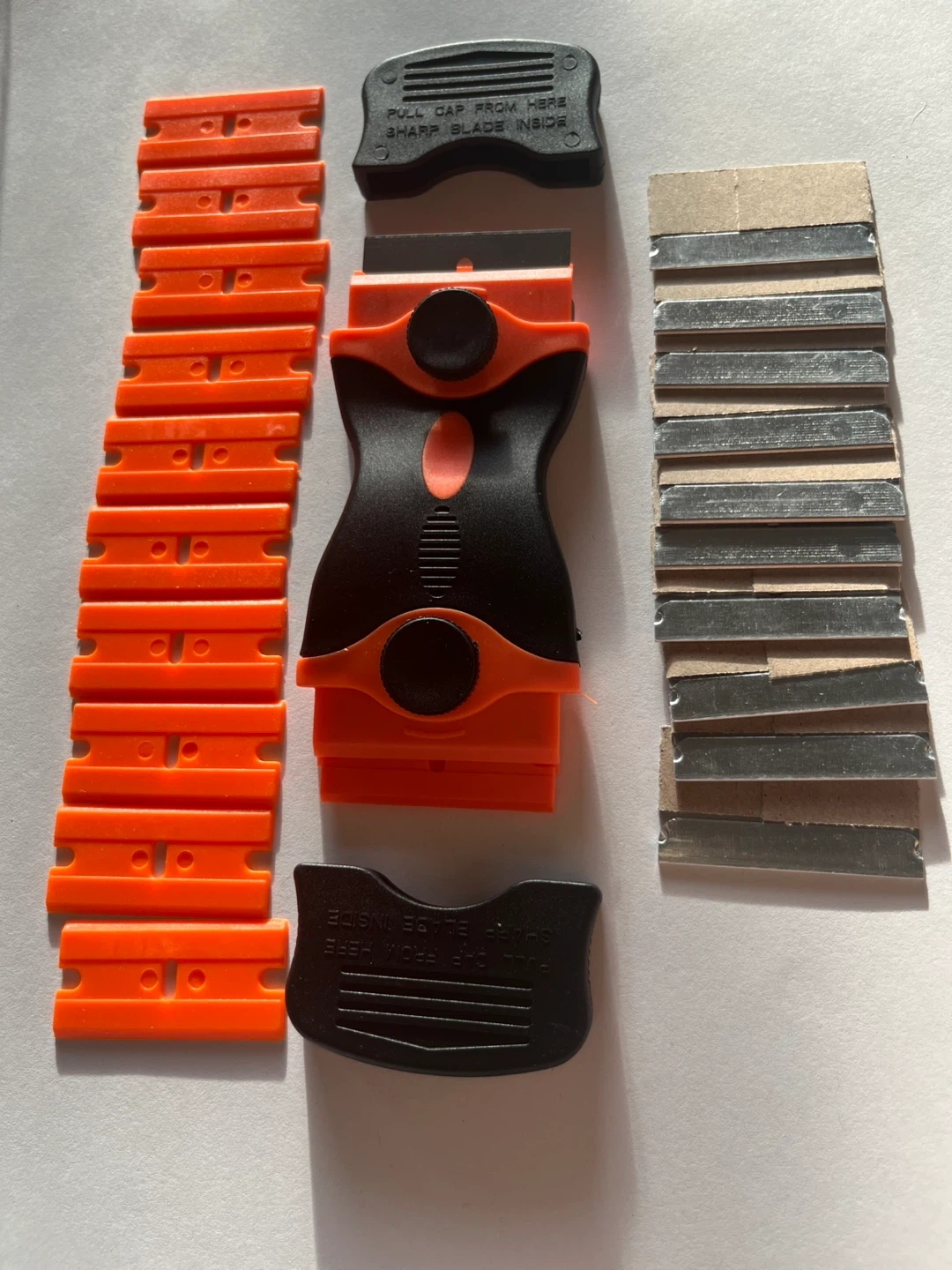 Selling a razor blade scraper tool set. It includes the scraper tool itself along with a selection of both plastic and metal blades. Perfect for removing stickers, decals, or other adhesive residue from surfaces. Great for home or auto use