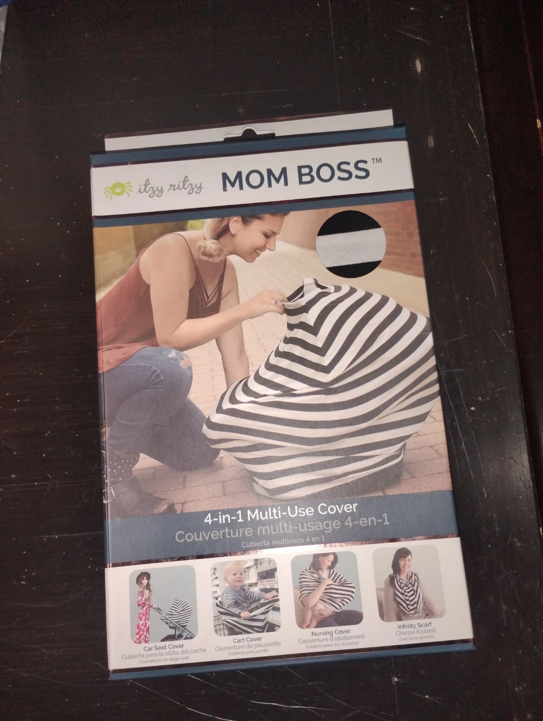 This Itzy Ritzy Mom Boss cover is designed for 4-in-1 multi-use! It can be used as a car seat cover, cart cover, nursing cover, or infinity scarf. The fabric features a black and white stripe pattern.