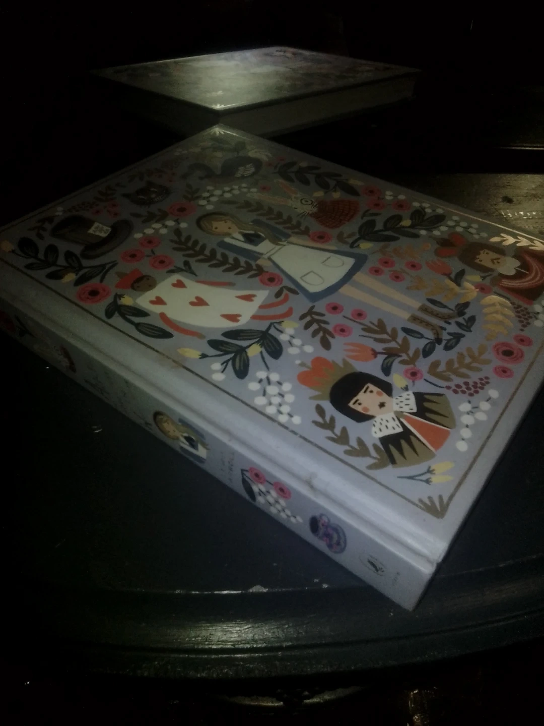 This decorative book features a charming Alice in Wonderland design. It's a hardcover with a colorful illustration on the front. Makes a lovely display piece!