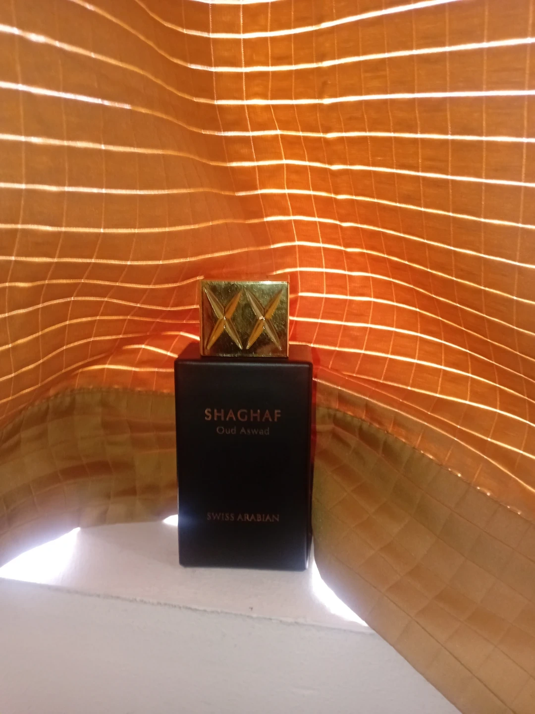 This is the Shaghaf Oud Aswad fragrance by Swiss Arabian. It's a sophisticated scent for everyday wear. The bottle has a black finish with a unique gold cap. Full bottle.