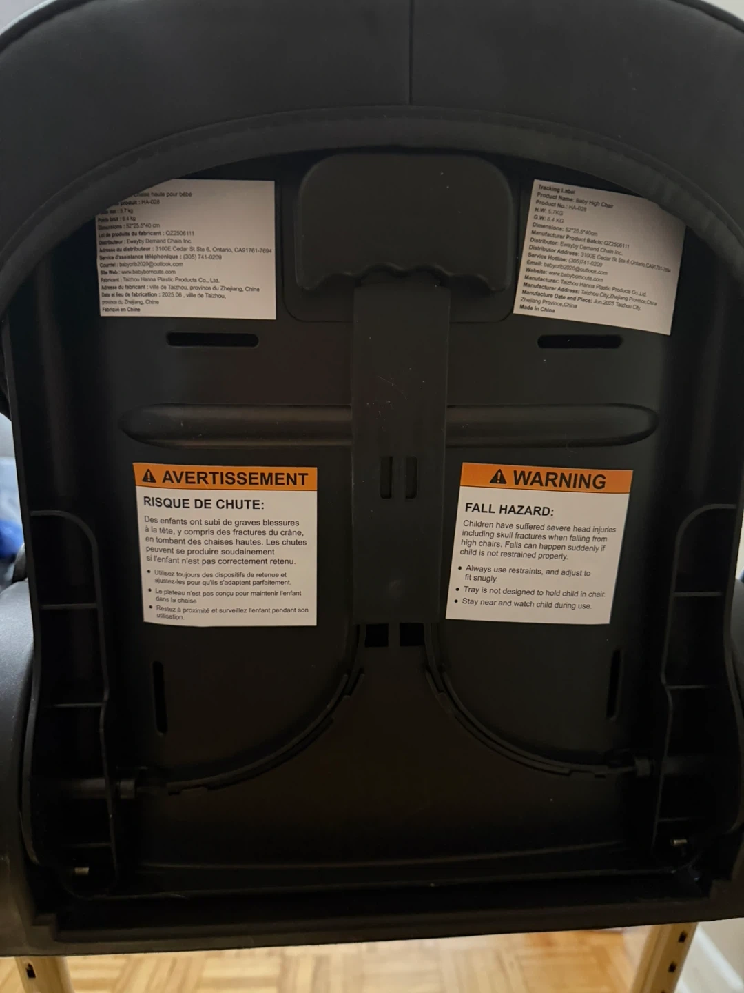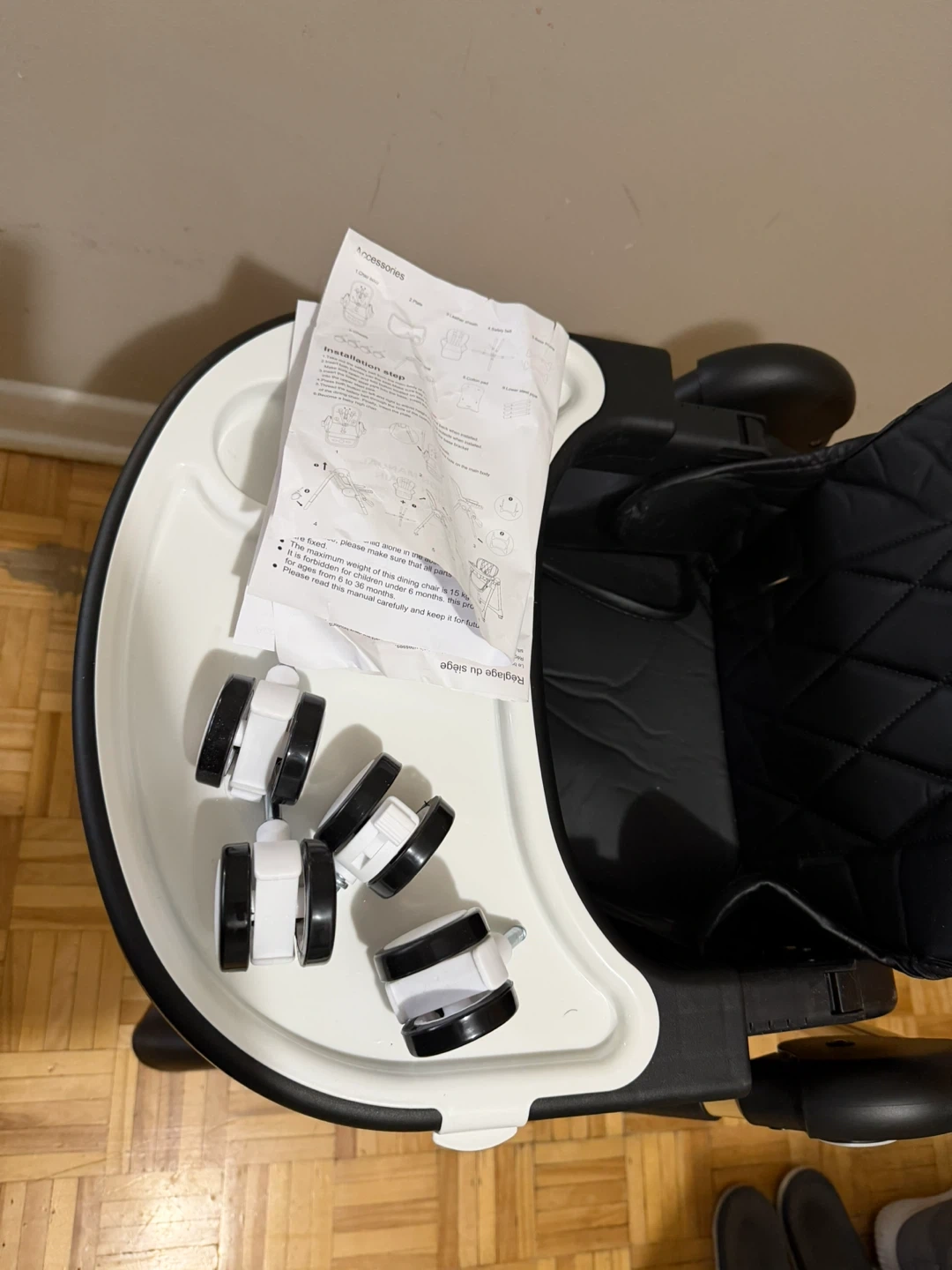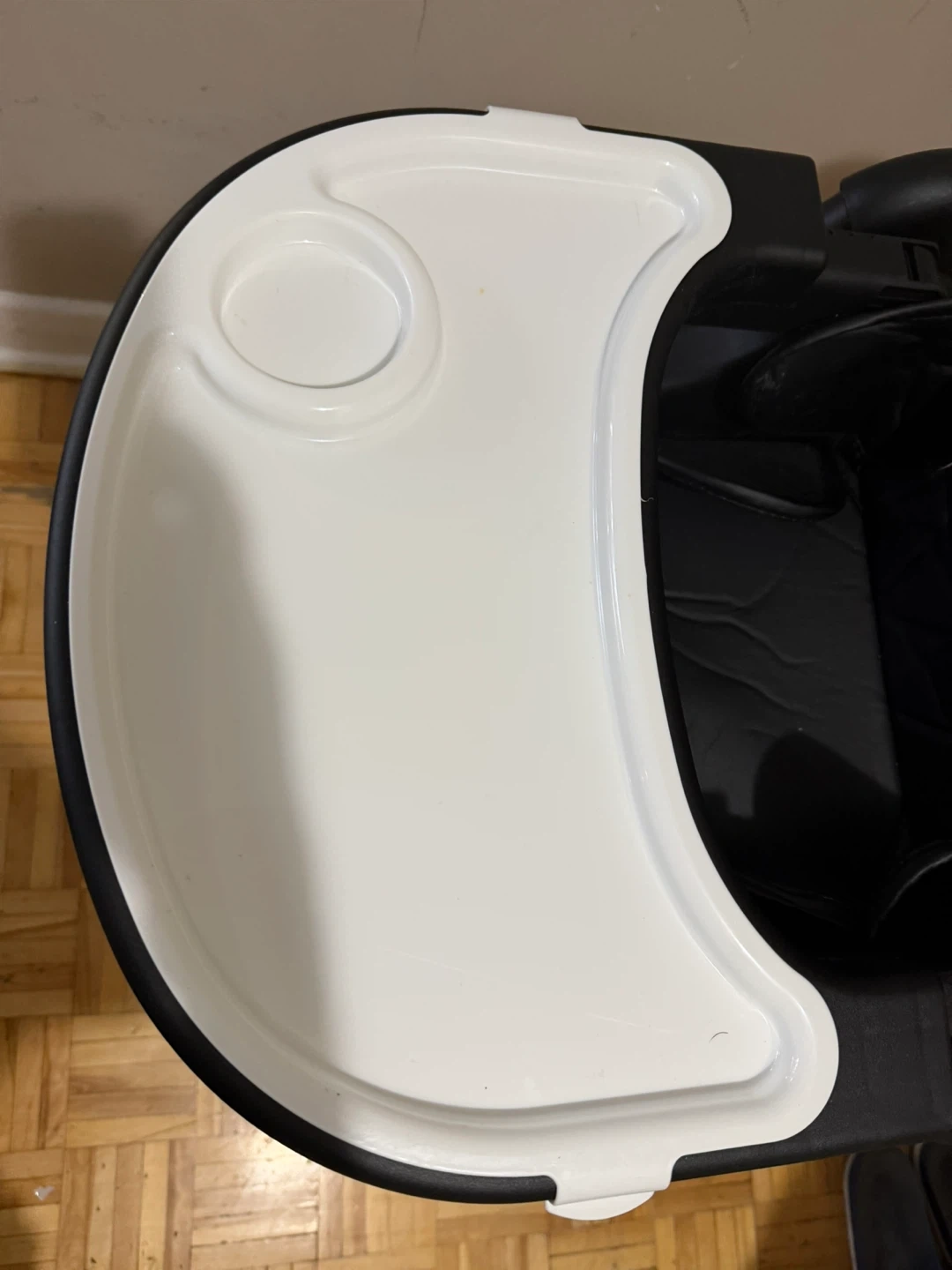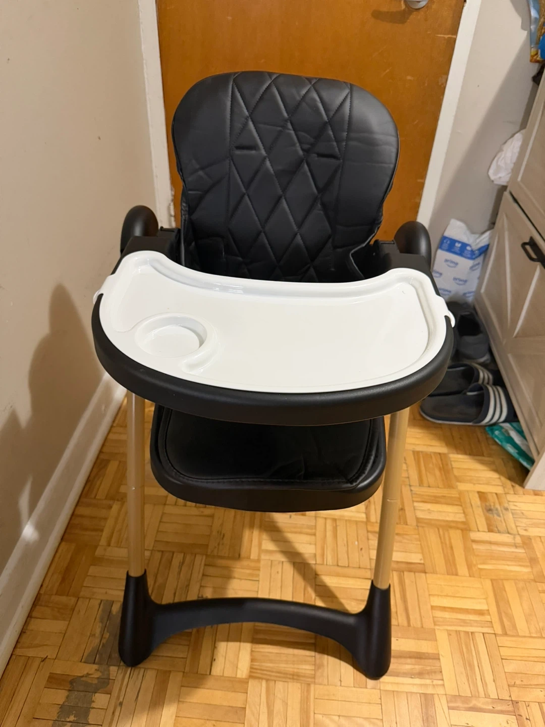 This Infantino baby high chair is black with a white tray. It's designed for safe meal times. Includes original box.