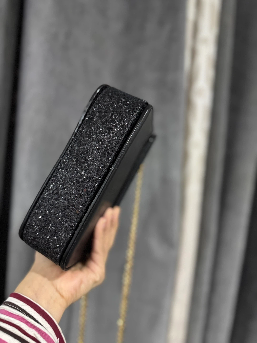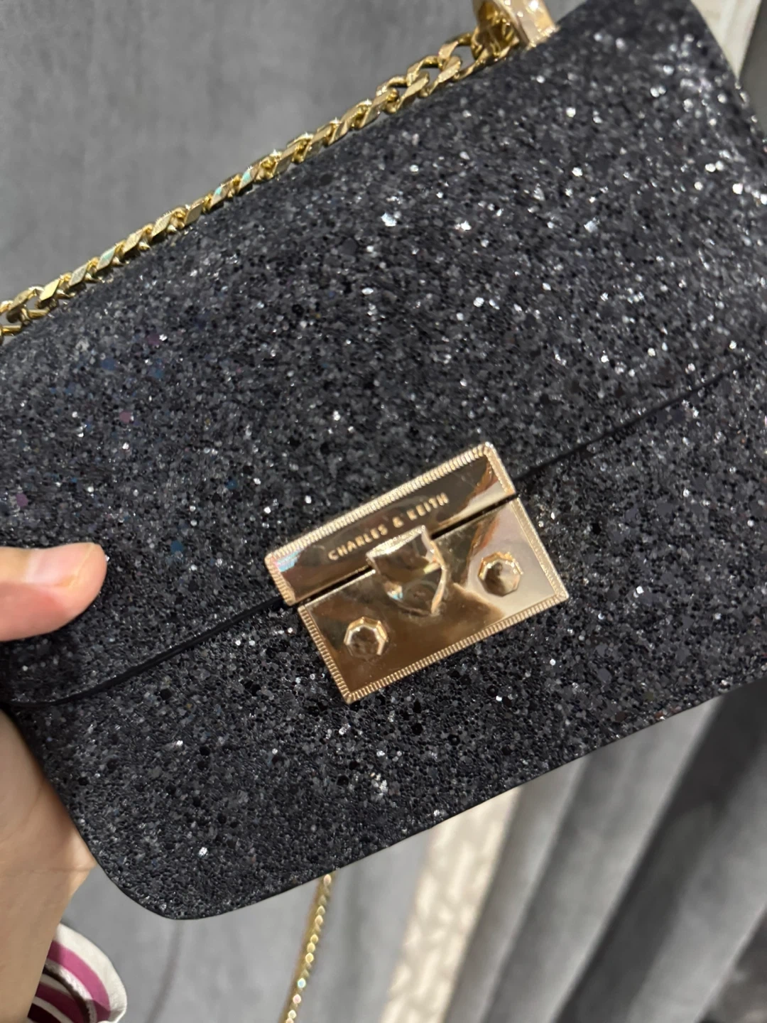 Selling a Charles & Keith black glitter chain bag. It's in great condition and perfect for adding a touch of sparkle to any outfit! The gold-tone chain complements the glitter beautifully