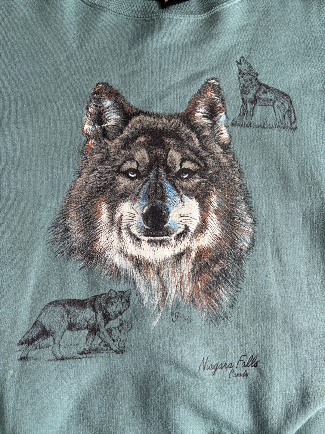 Embrace the wild with this stylish green sweater featuring a striking wolf print. Perfect for casual outings, this sweater combines comfort with a touch of nature-inspired design. Cotton/poly blend. In good used condition. 28” pit to pit.