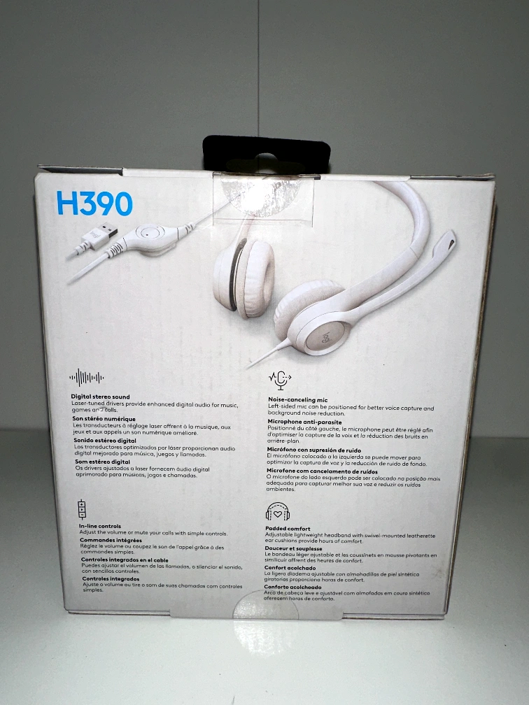 95Selling a Logitech H390 USB computer headset in white. It's in great condition and comes with its original box. This headset features digital stereo sound and a noise-cancelling mic, perfect for clear communication and immersive audio. It also has in-line controls for easy adjustments. A comfortable and lightweight design makes it ideal for long hours of use