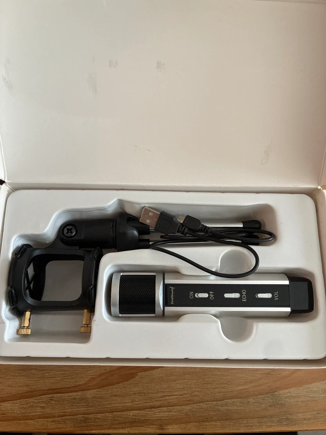 Selling a ZealSound portable microphone! It's a condenser mic in silver. Comes with all the components in the box, as pictured