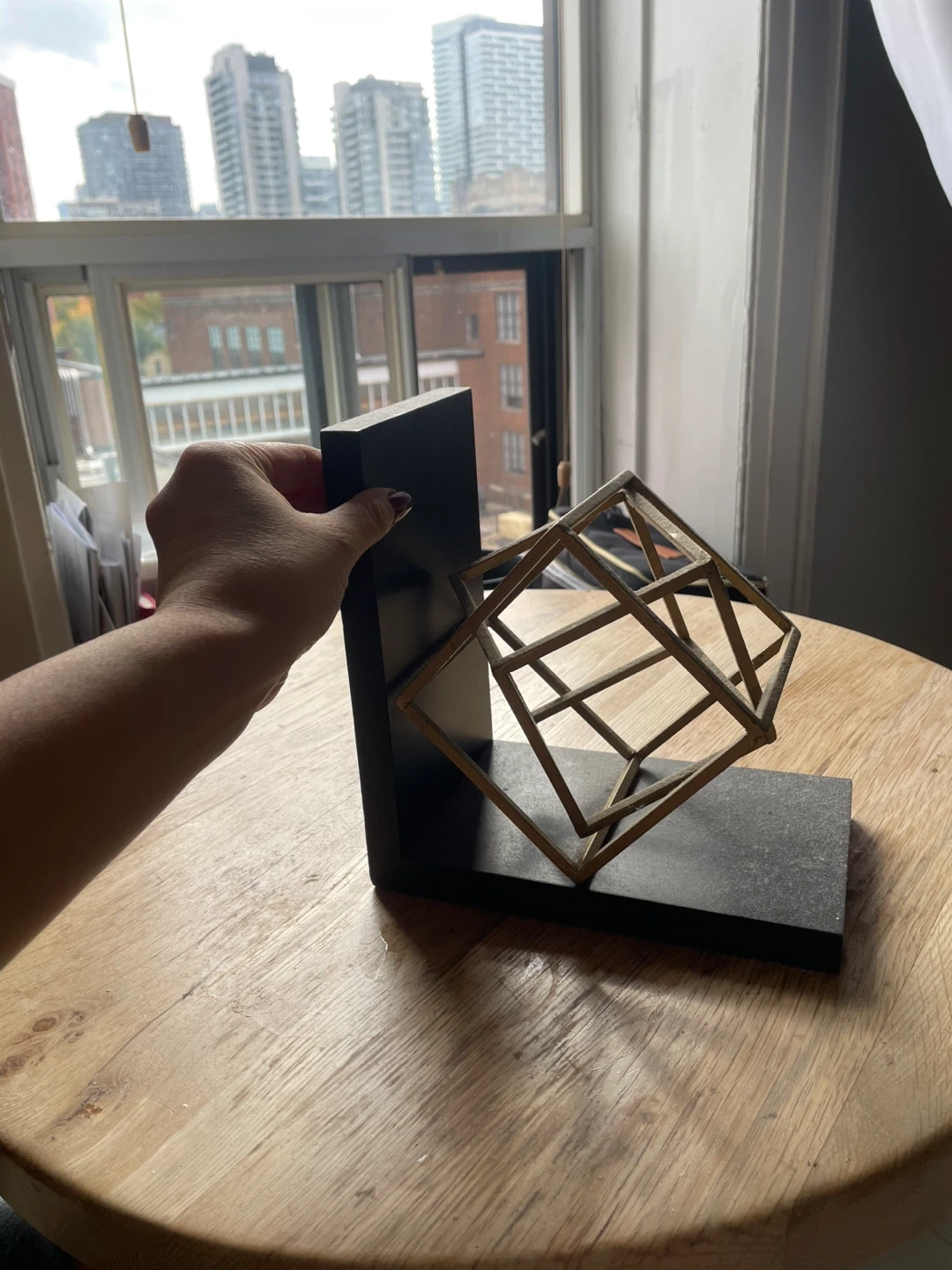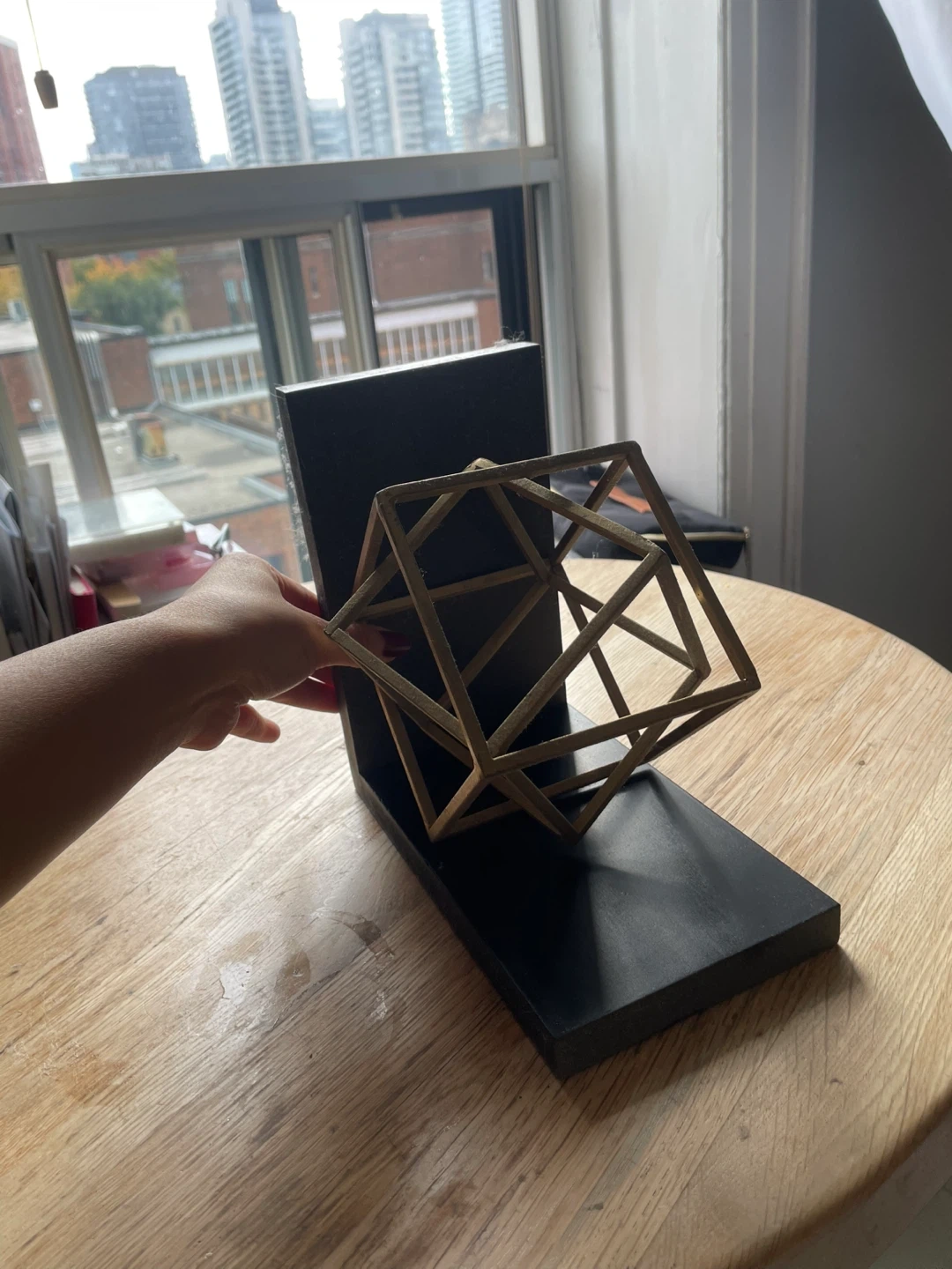 Selling a stylish geometric bookend, perfect for adding a modern touch to your shelves! The combination of black and gold makes it a unique and eye-catching piece for any room