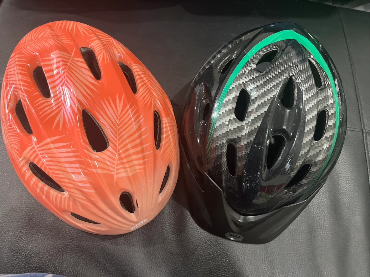 Two bike helmets for sale! One is peach with a palm leaf design, and the other is black with a carbon fibre pattern and green accents. Both are in good condition and ready for your next ride!