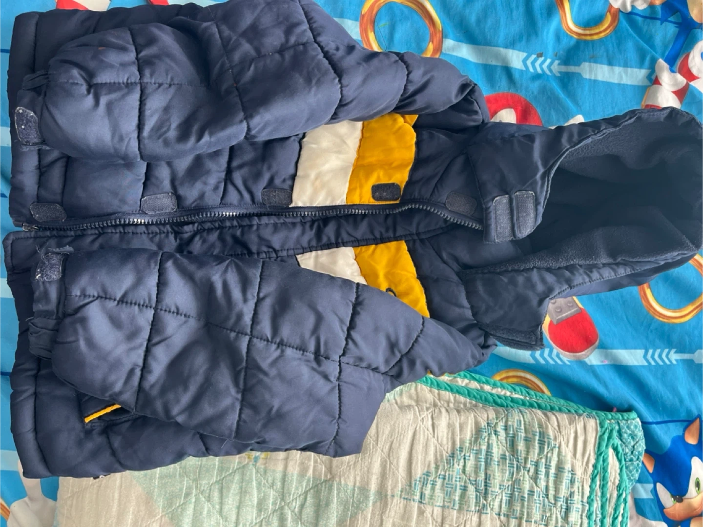 20A cozy navy blue puffer jacket, perfect for keeping warm on chilly days! It features a quilted design and a fleece-lined hood for extra comfort. Great for kids!