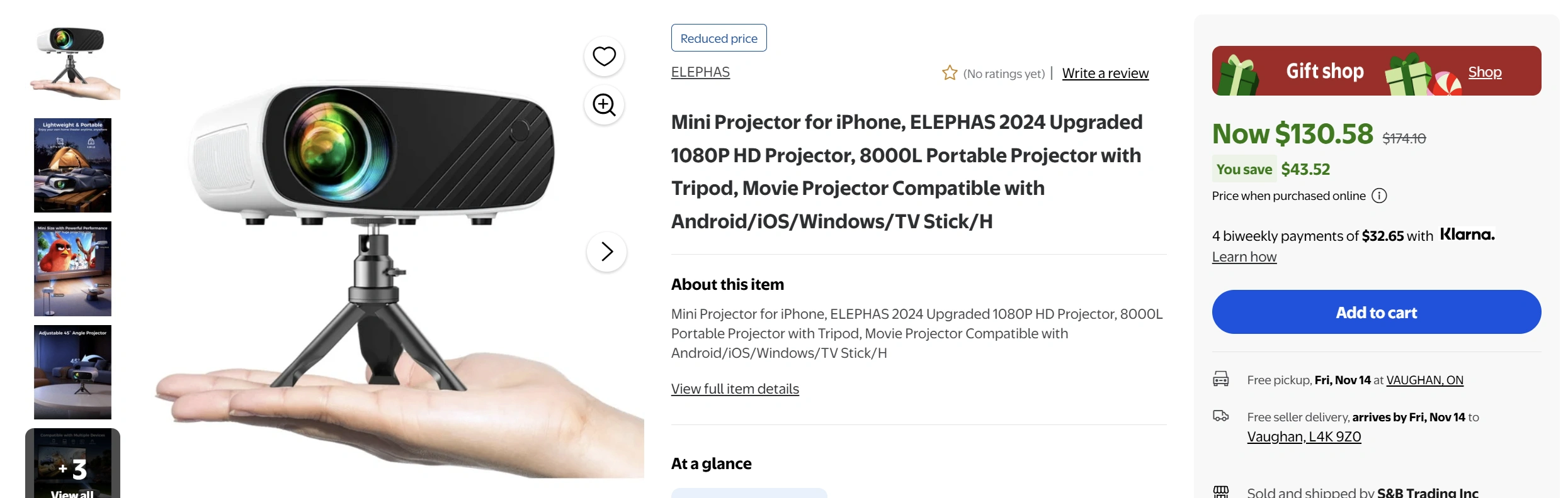 Website: https://www.walmart.ca/en/ip/Mini-Projector-iPhone-ELEPHAS-2024-Upgraded-1080P-HD-Projector-8000L-Portable-Tripod-Movie-Compatible-Android-iOS-Windows-TV-Stick-H/4FJ0U2PHHGOP?classType=REGULAR&athbdg=L1700