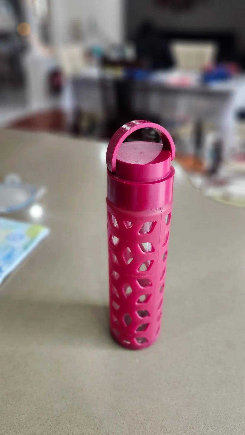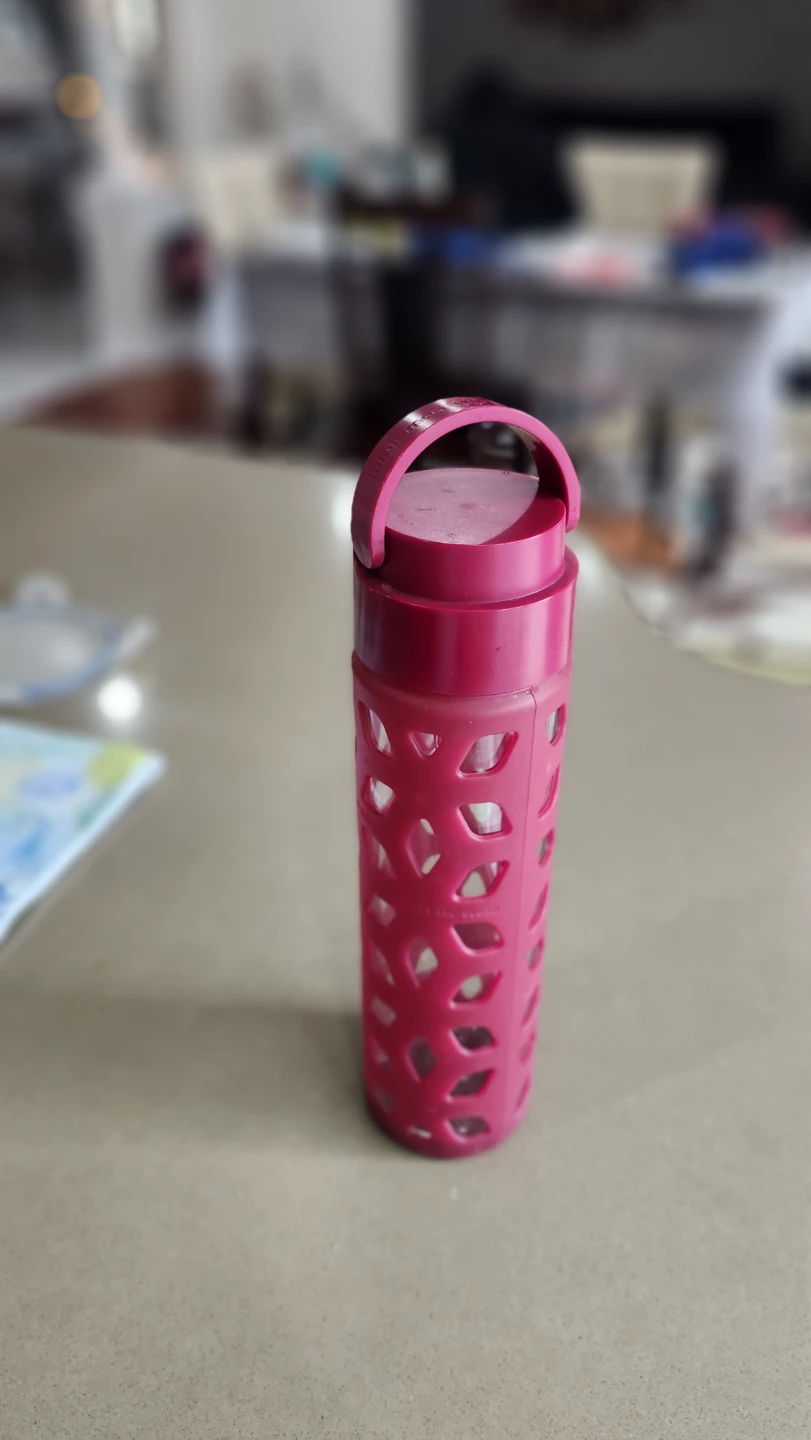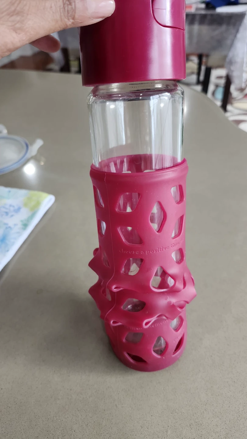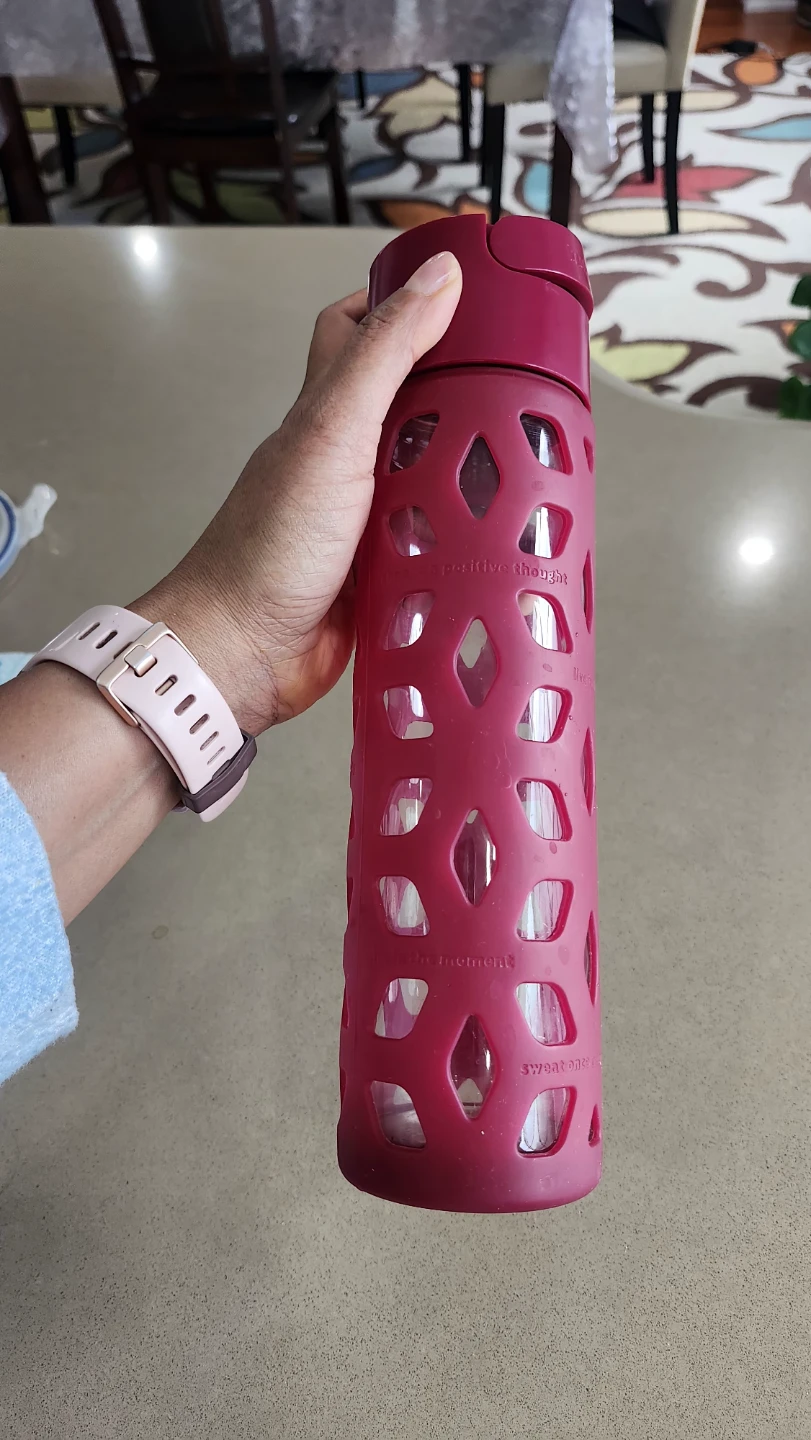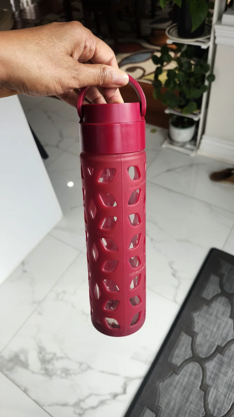 Selling a Lululemon glass water bottle in a lovely red colour silicone cover foe protection It has a unique cover design with cutouts around the bottle and a convenient carrying handle on the lid. Perfect for staying hydrated during your workouts or daily activities.