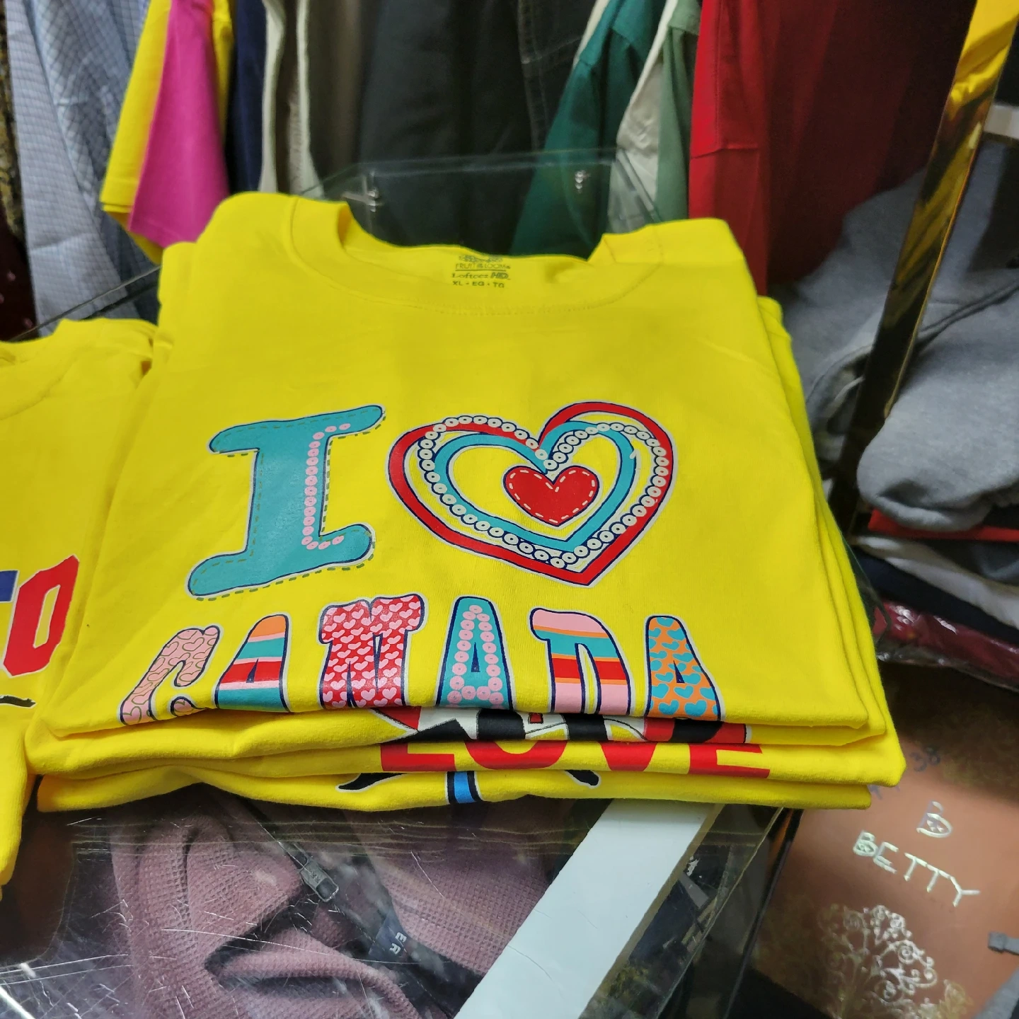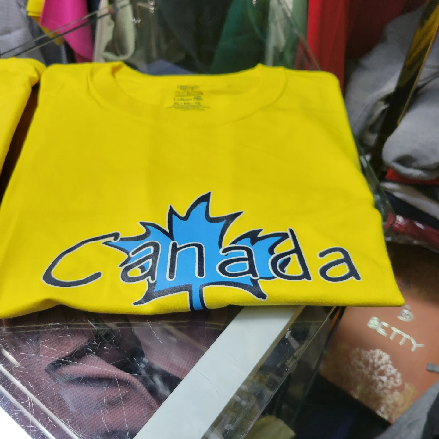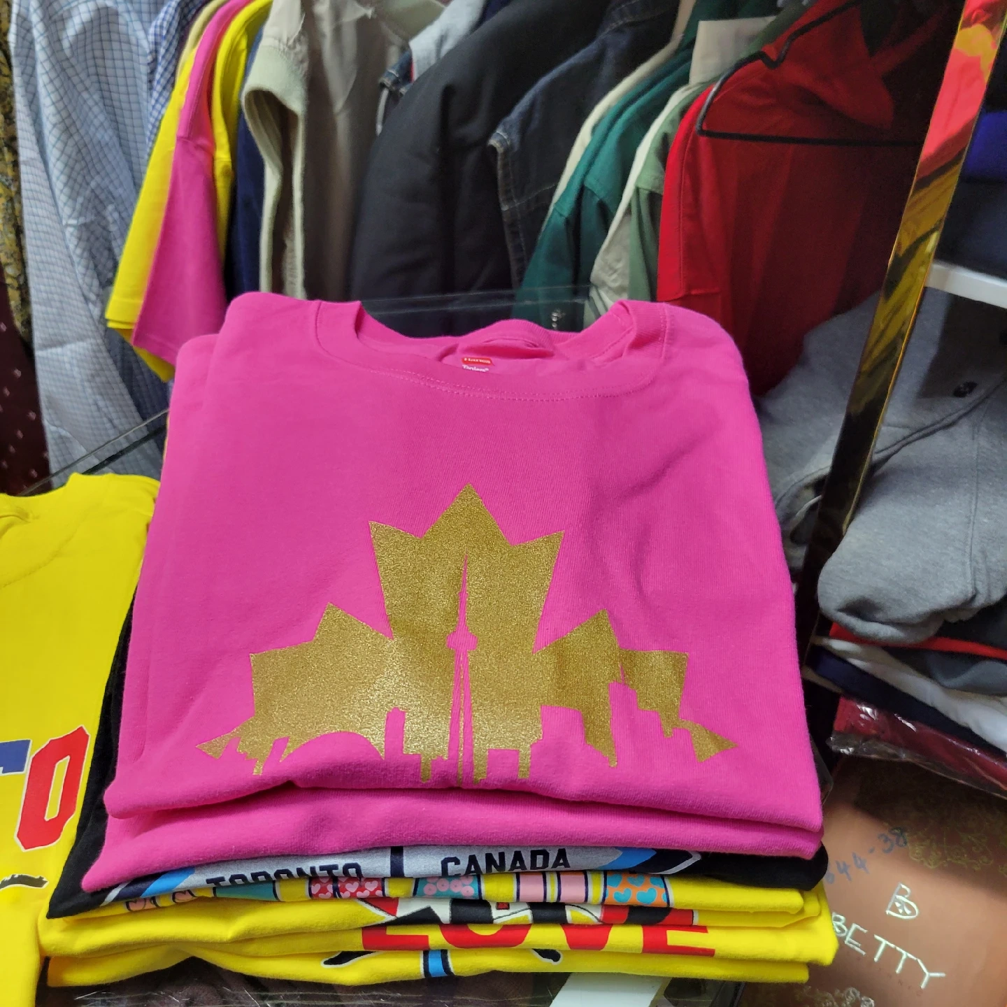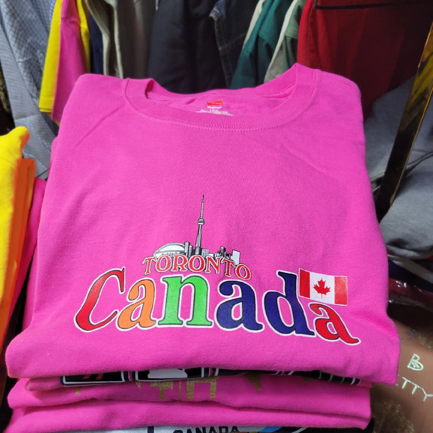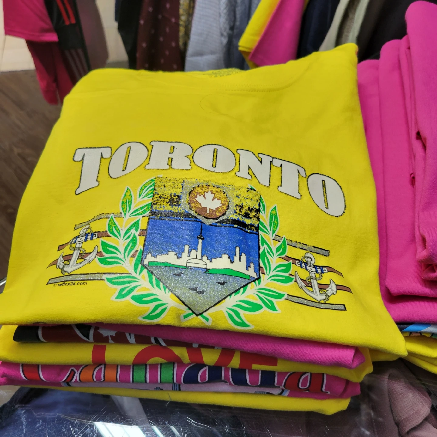 109Selling a stack of fun Toronto Canada t-shirts! There's a mix of yellow and pink tees, and they're all size L XL. Great for showing off your Canadian pride