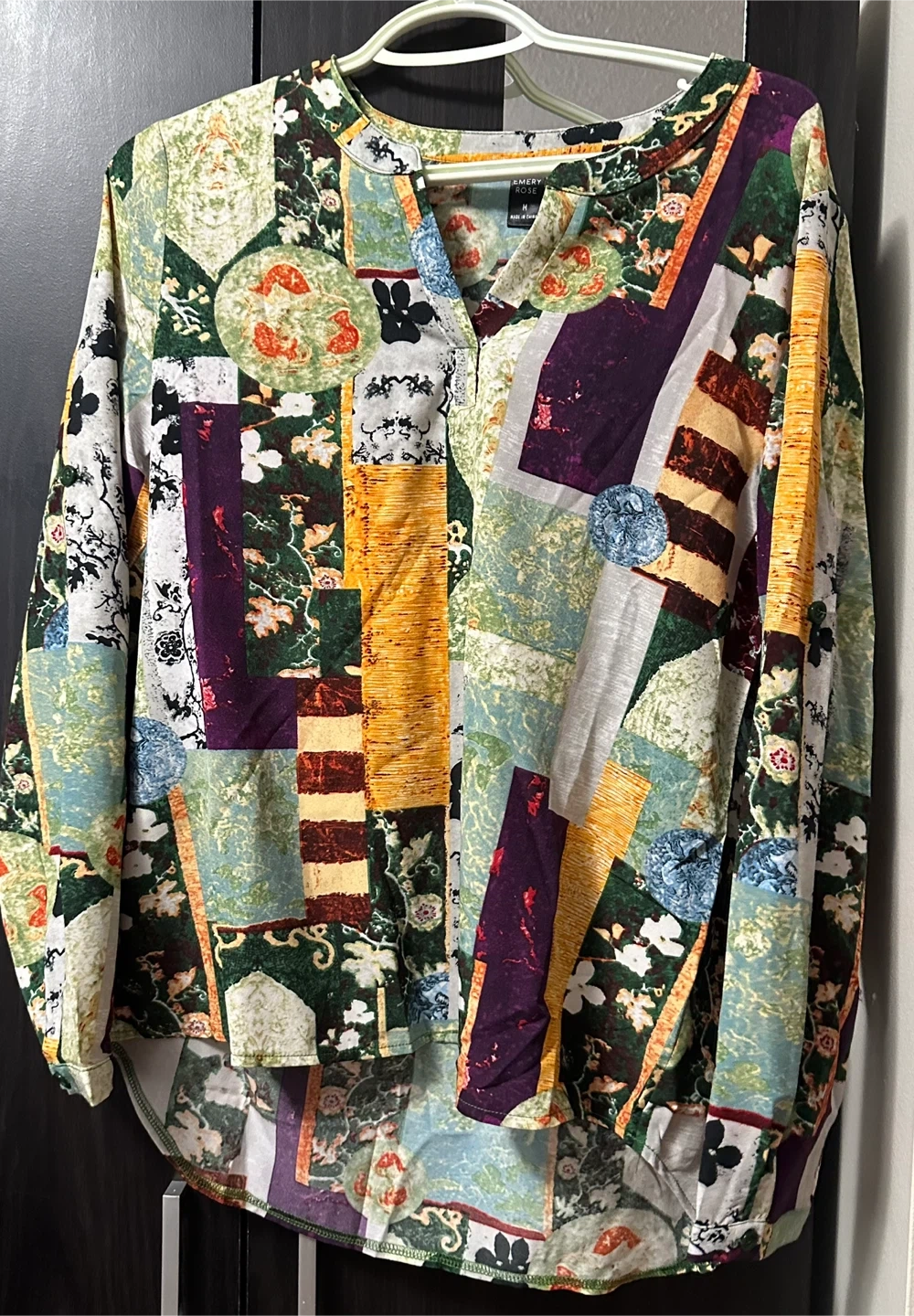 Here's a gently used Emery Rose blouse in a size medium! It features a unique multicolor patchwork design. Perfect for adding a pop of colour to your wardrobe!