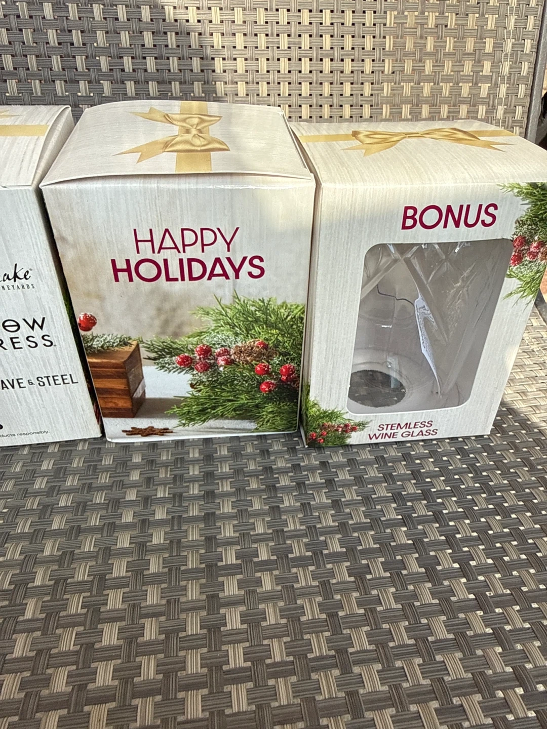 Selling a set of stemless wine glasses, perfect for the holidays! Each glass comes in its own decorative box with a festive design. The boxes are in great condition and would make a lovely addition to your holiday table setting or a thoughtful gift for a wine lover.