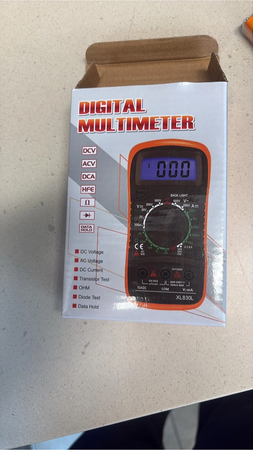Selling a digital multimeter, model XL830L. It can measure DCV, ACV, DCA, HFE, resistance, DC voltage, AC voltage, DC current, transistor test, OHM, diode test, and data hold. Comes with the multimeter, test leads, and a battery
