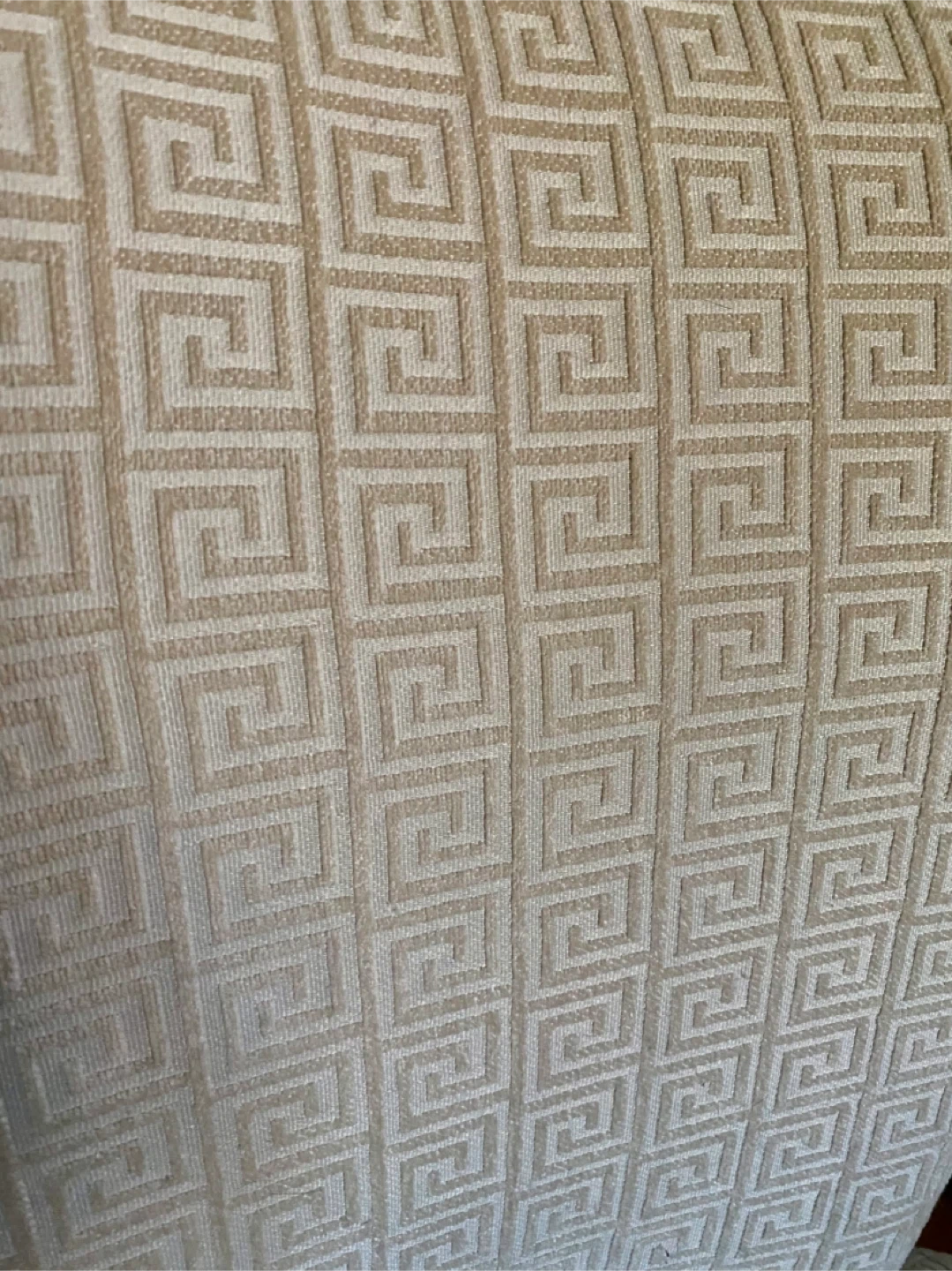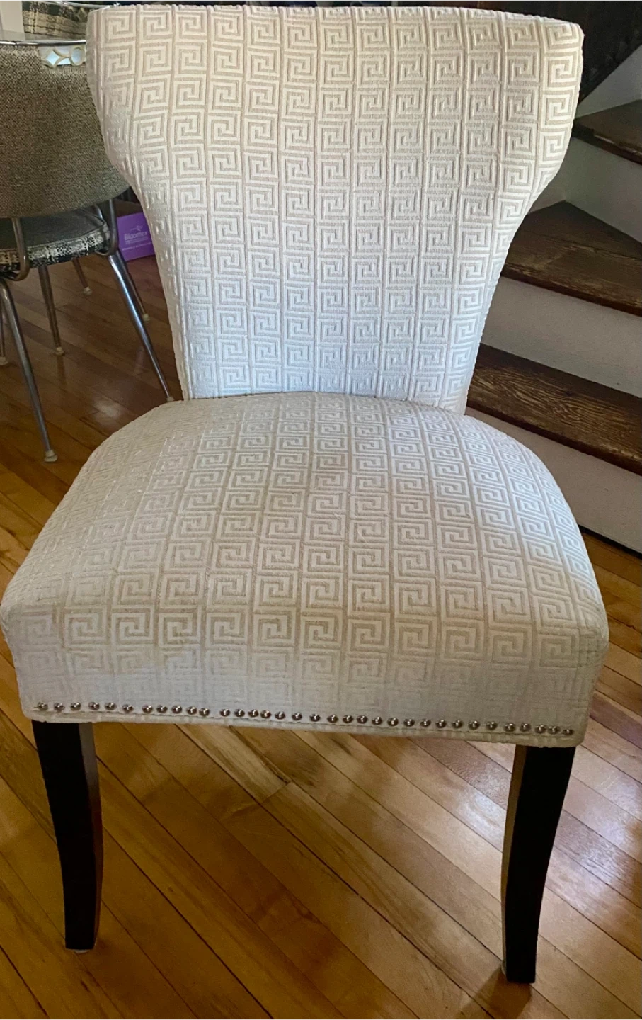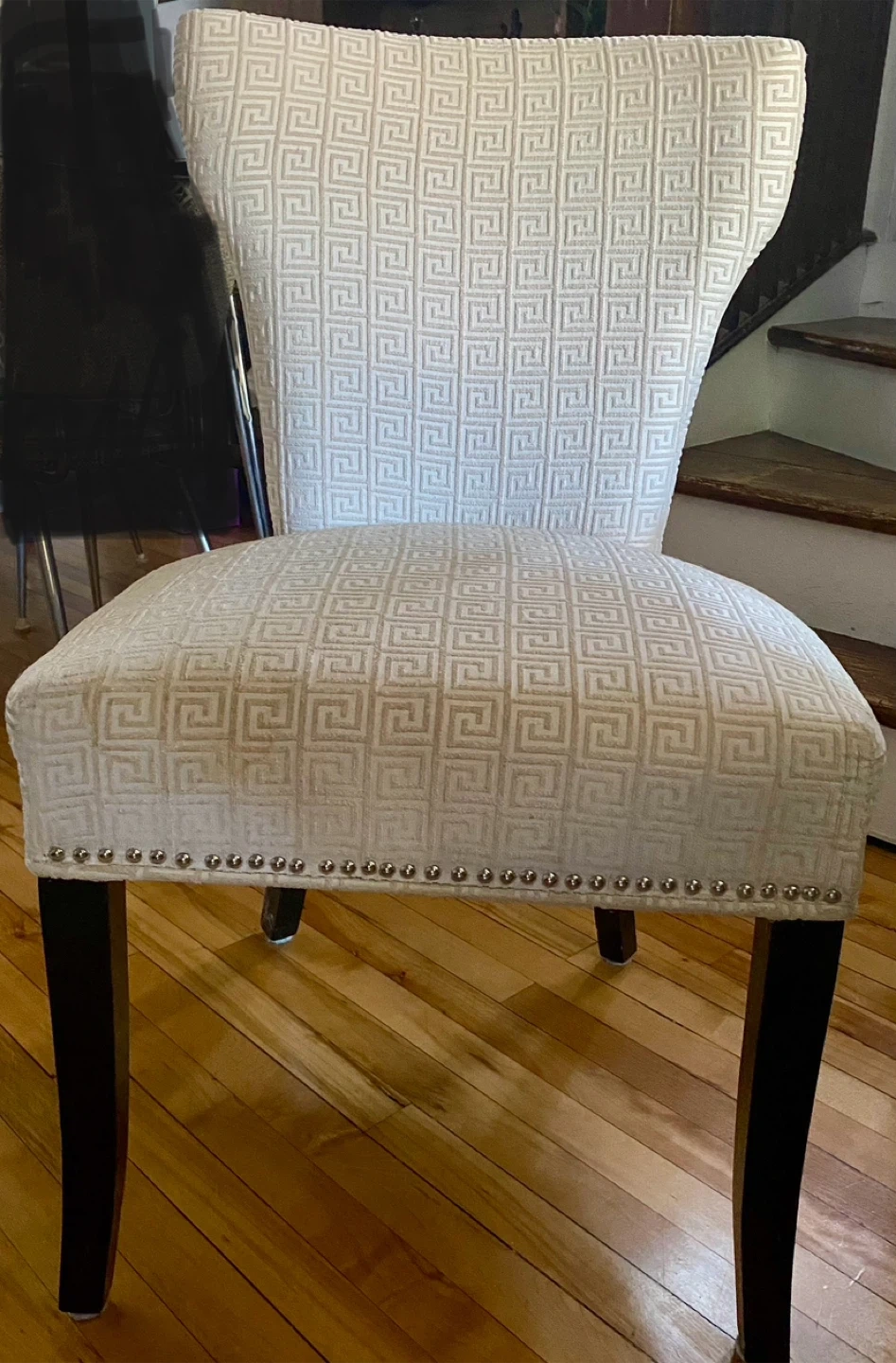 Add a touch of modern charm to your space! This white accent chair features a striking square swirl pattern, a wide cushioned seat for extra comfort, decorative metal studs, and solid wooden legs. Perfect for elevating any room with effortless style and sophistication.