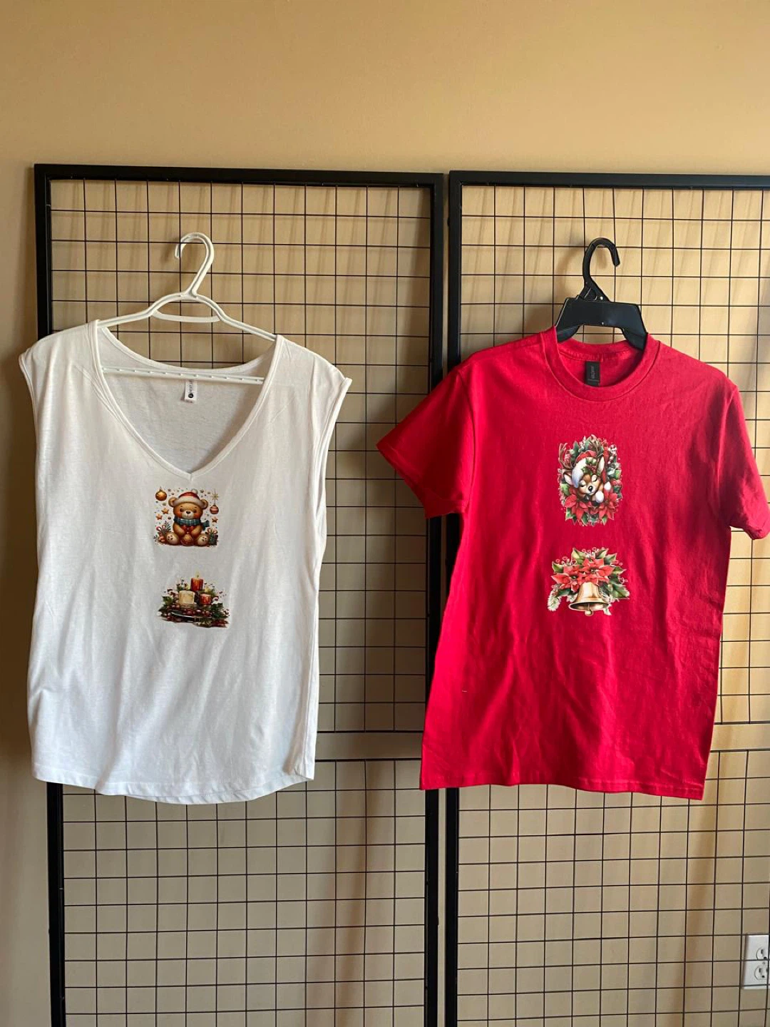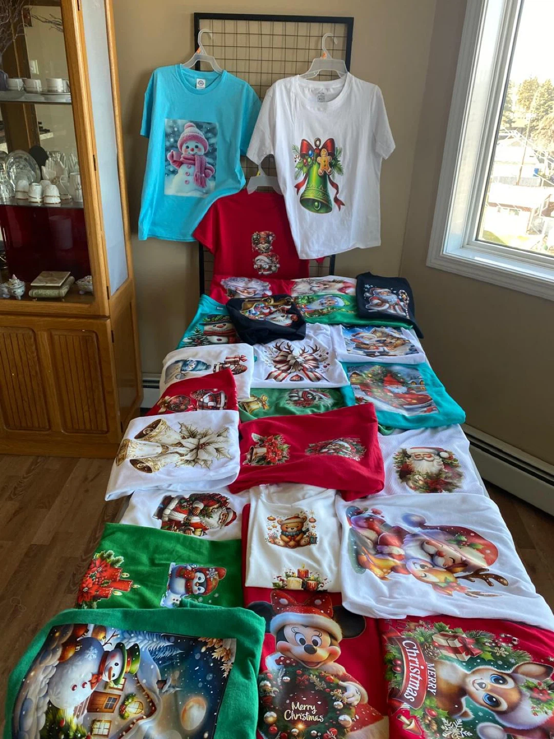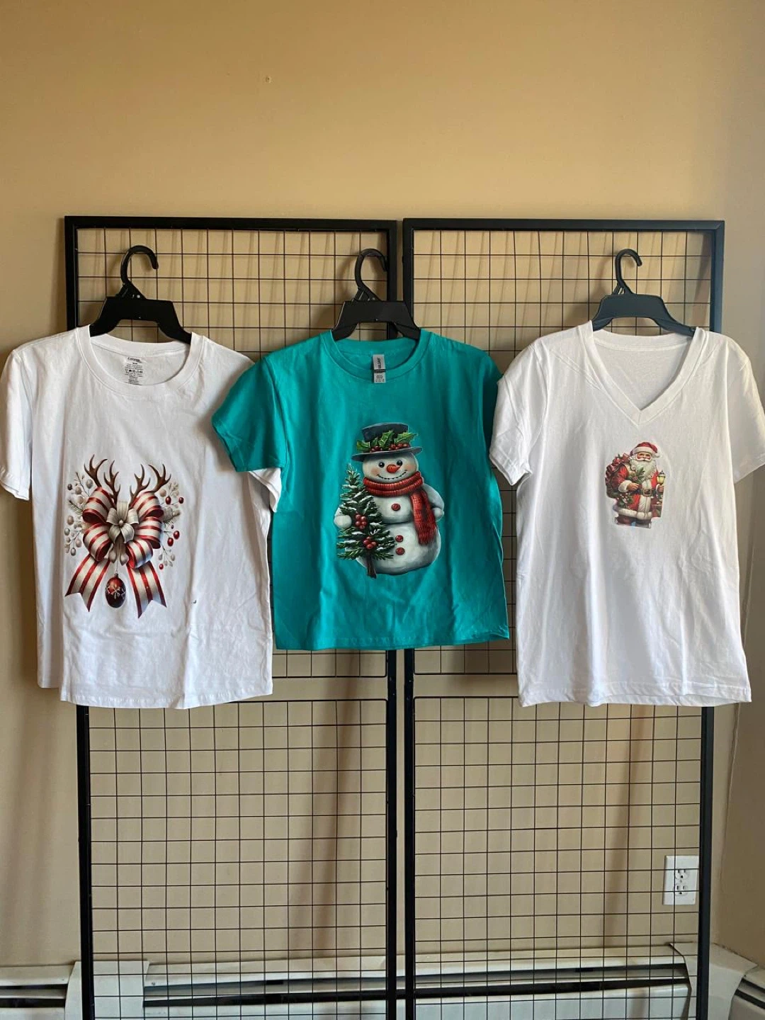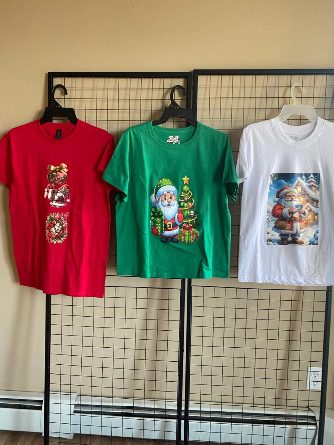 A variety of Christmas themed graphic t-shirts are available. They come in different colors and sizes. Perfect for the holiday season!