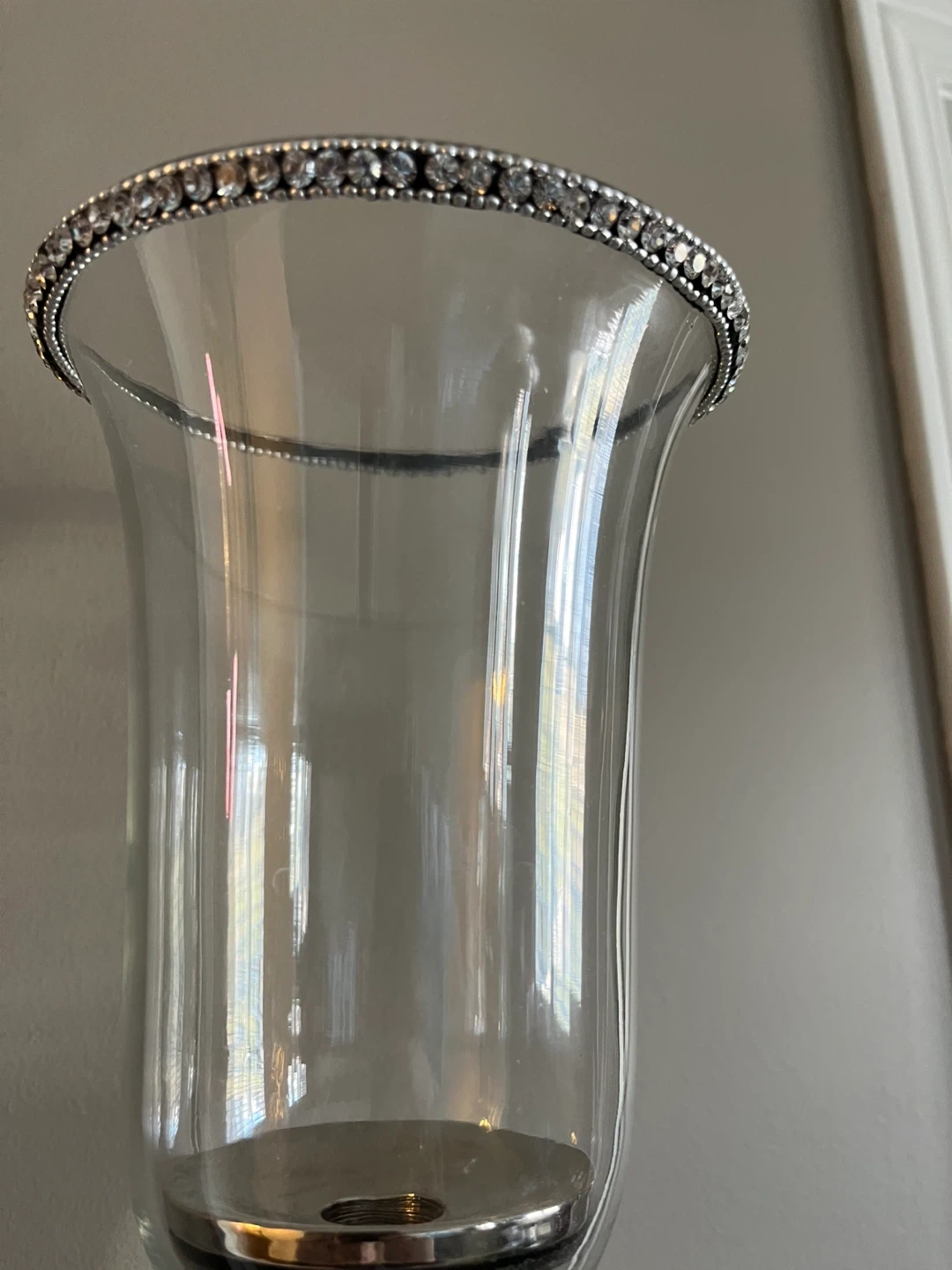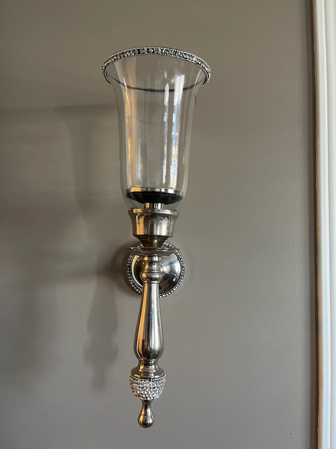 65Add a touch of sparkle to your home with this beautiful silver wall sconce! It features rhinestone accents for an elegant look. Perfect for creating a warm and inviting atmosphere in any room- moving sale- smoke free home