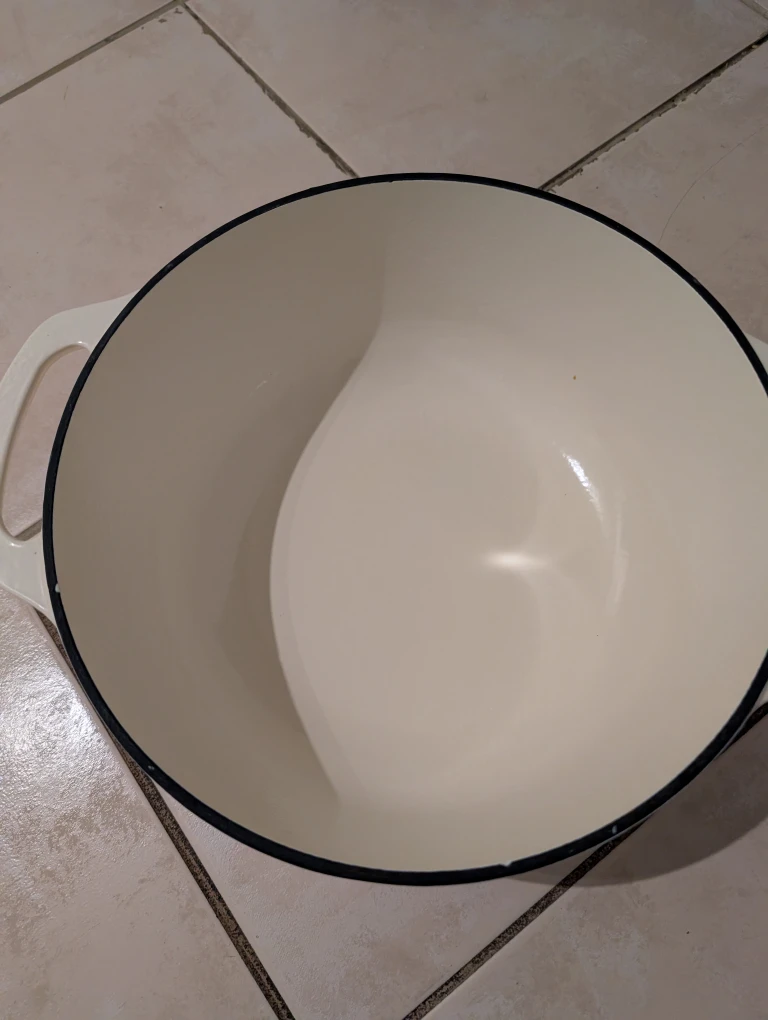 Selling a lovely white Dutch oven, perfect for all your cooking needs! It comes with a matching lid. It's in great condition and ready for a new home in your kitchen. 6 quart. Cast iron.