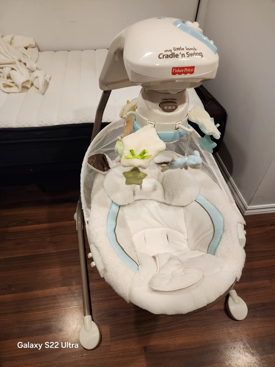 Selling a Fisher-Price My Little Lamb Cradle 'n Swing. It's in great condition and ready for a new little one! The swing is designed to soothe and comfort your baby with gentle motions and sounds. It features multiple swing speeds, calming music, and nature sounds to help your baby relax. The seat is plush and cozy, providing a comfortable space for your little one to rest and play