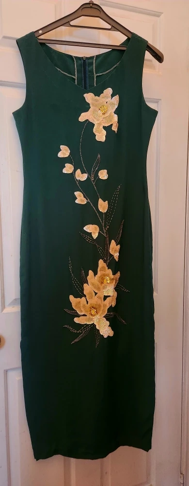 Selling a lovely green dress with beautiful floral embroidery. It's in great condition and would be perfect for a special occasion or a night out!