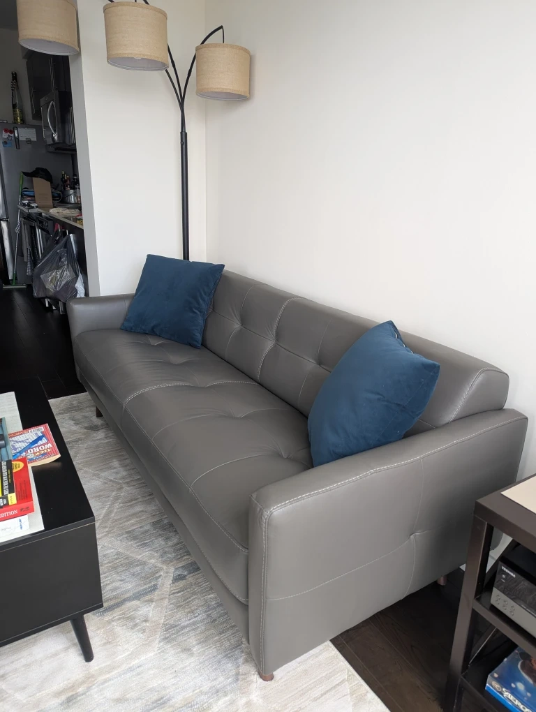 Selling a comfy grey leather sofa imported from italy. 100% genuine Italian leather.It's in brand new shape and sat on maybe 7-8 times. Only months old ,,paid 2300$ for it. Would look great in any living room or den! The leather is soft and supple, and the cushions are nice and plush
