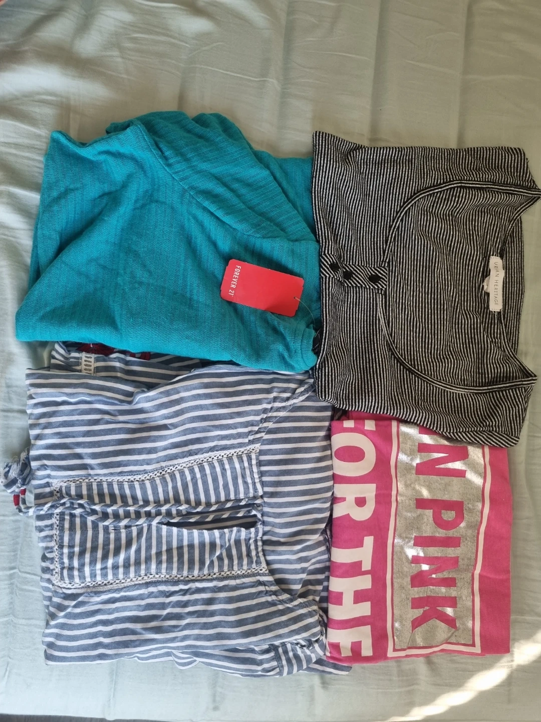 Selling a bundle of women's tops including brands like Forever 21, Urban Heritage, and Tommy Hilfiger! Great for adding some variety to your wardrobe as each top is a different color. All tops are sized S except the pink t shirt which is sized L but i think would fit S-M