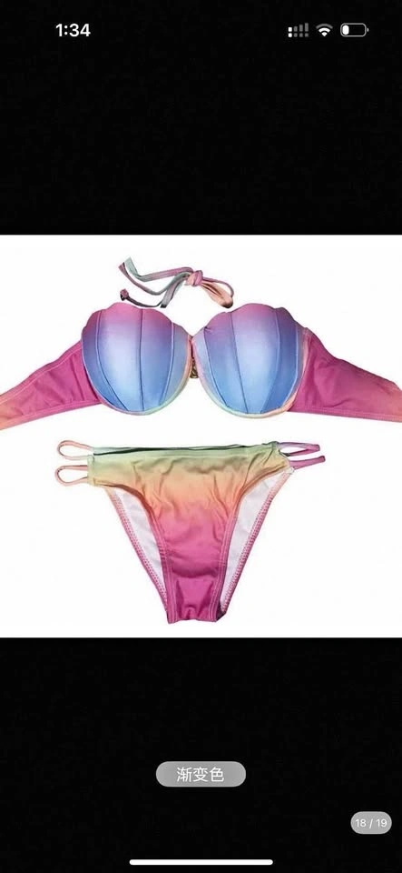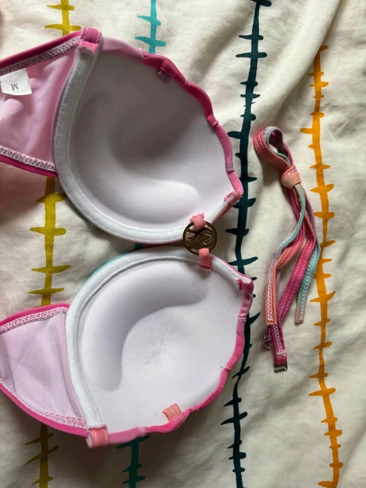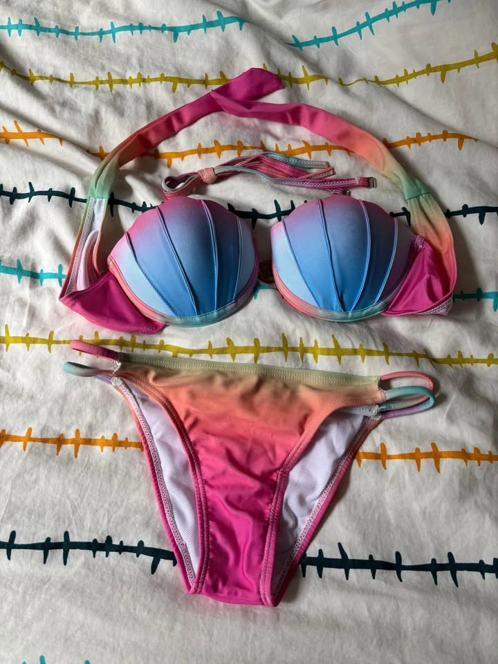 15Never worn! Multicolored mermaid swimsuit set! It’s a bit too small for me. The top is tie-back! Comes with removable straps and what looks like pretty supportive padding :) Size chart recommends 80-88cm for the bust and 85-91cm for the hips :)