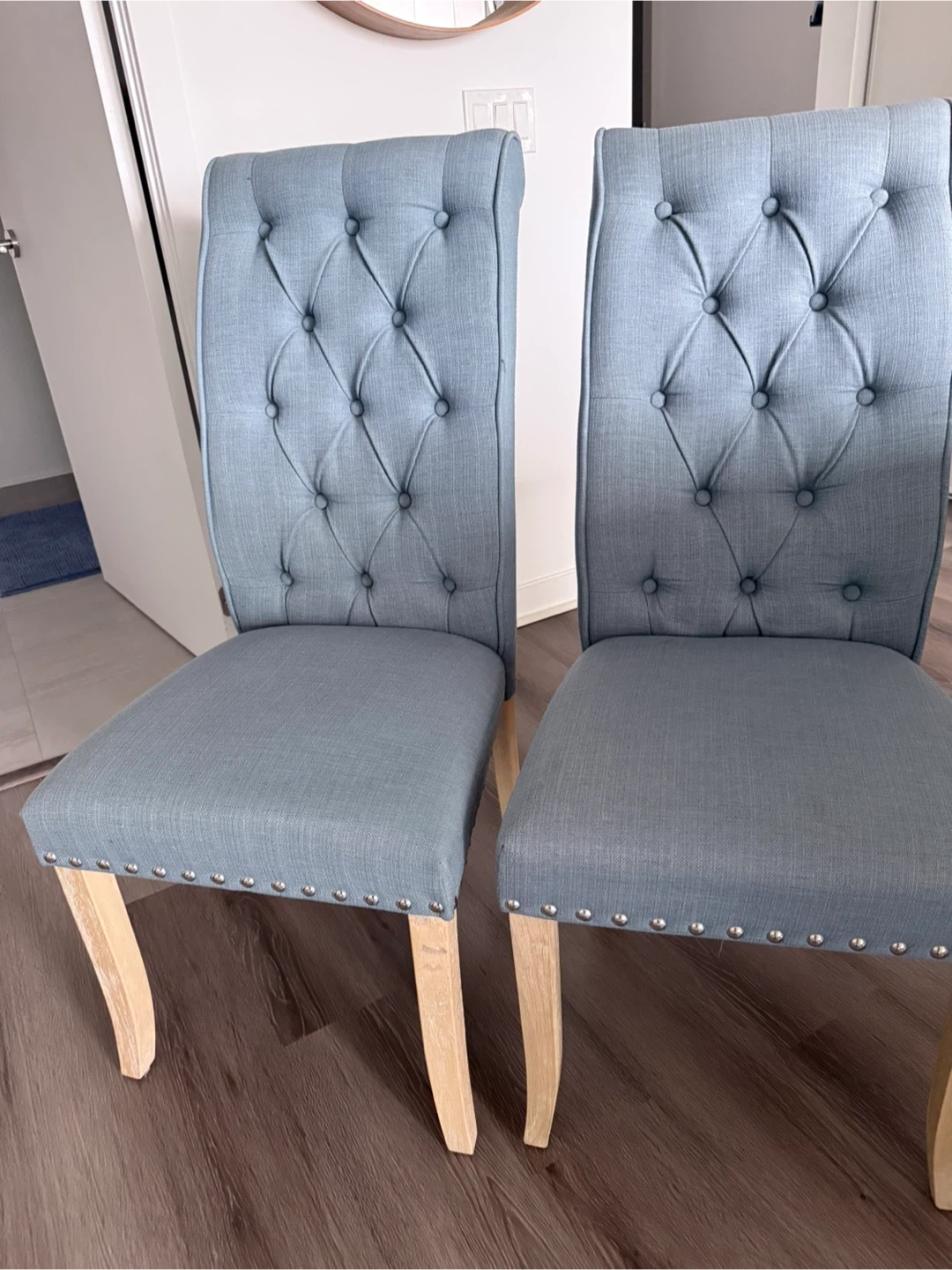 Selling a set of two upholstered dining chairs. They feature a lovely button-tufted back and light wood legs. These chairs would add a touch of elegance to any dining space! They're in great condition and ready for a new home. Price for both units. No low ballers please