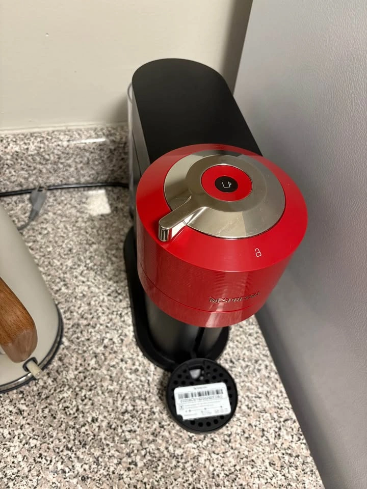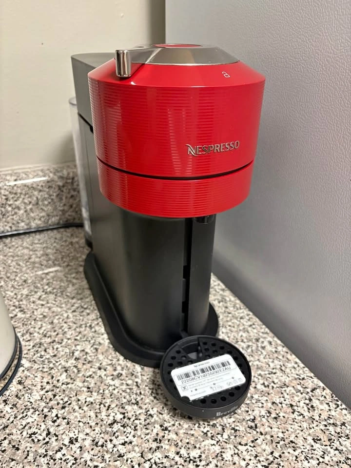 175Nespresso Vertuo Next Coffee and Espresso Machine by Breville in red. It features: * 5 programmable cup sizes: Espresso (1.35 oz), Double Espresso (2.7 oz), Gran Lungo (5 oz), Mug (7.7 oz) and Alto (14 oz) * Red, glossy design finish * 20-25 second heat-up time * Sleek & modern new design with a smaller footprint and chromed accents * Centrifusion technology spins capsules up to 7,000 rotations per minute * One-button operation with capsule recognition * Connectivity via Bluetooth and Wi-Fi for software updates * Dimensions: 12.4" x 5.5" x 14.7" Pickup from downtown.