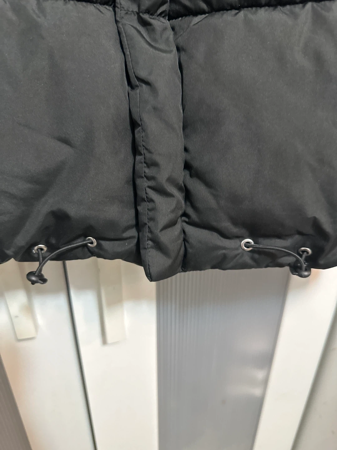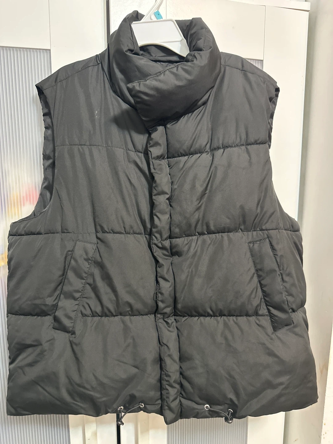 Selling a SHEIN black puffer vest in size small! It's in great condition and perfect for layering during the cooler months. The vest features a high collar and a drawstring at the bottom.
