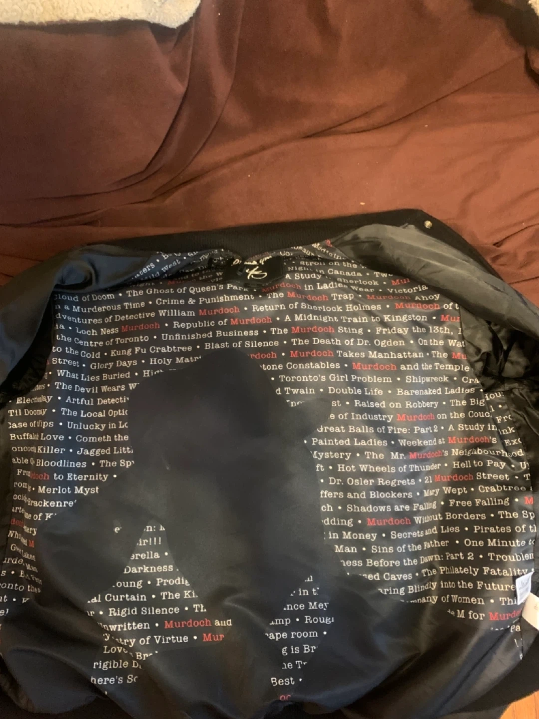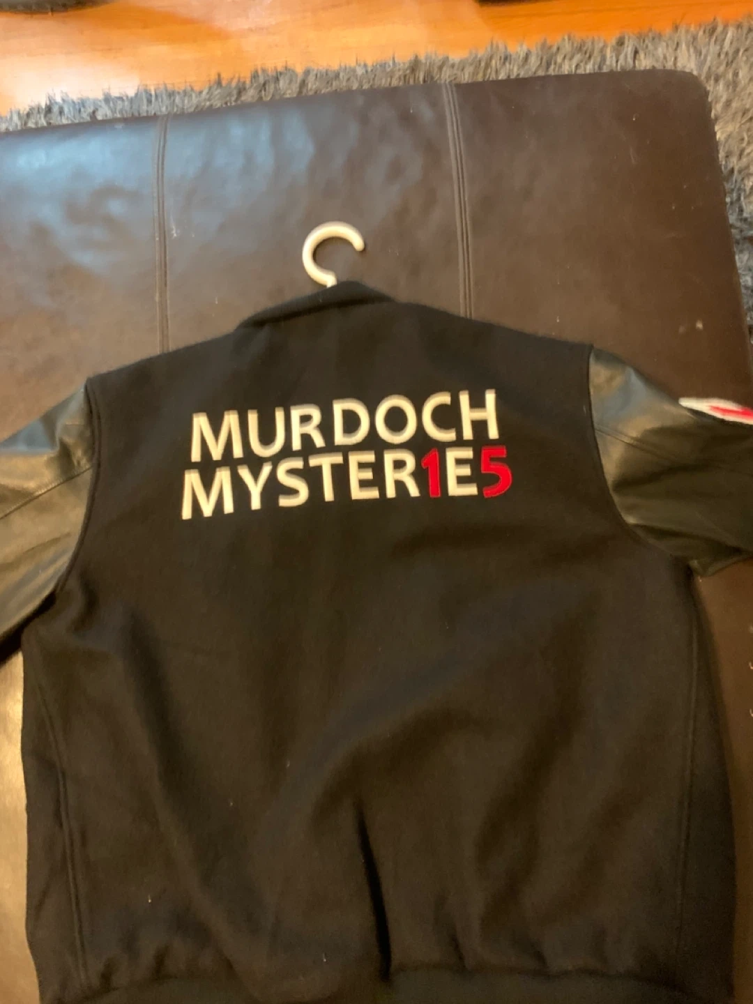 Here's a cool Murdoch Mysteries varsity jacket from Roots! It's black with leather sleeves and features the Canadian flag, the Roots logo, and a clown graphic. The inside lining has a bunch of Murdoch Mysteries episode titles printed on it . It ’s size is large