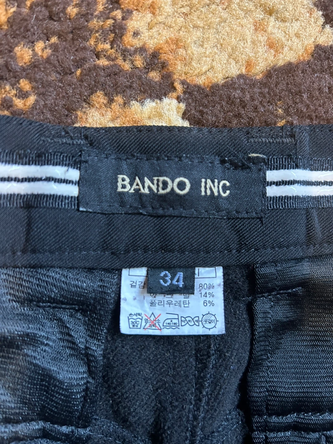 Selling a pair of BANDO INC black pants in size 34. The material is 80% polyester, 14% rayon, and 6% polyurethane. They are in great condition and ready for a new home!