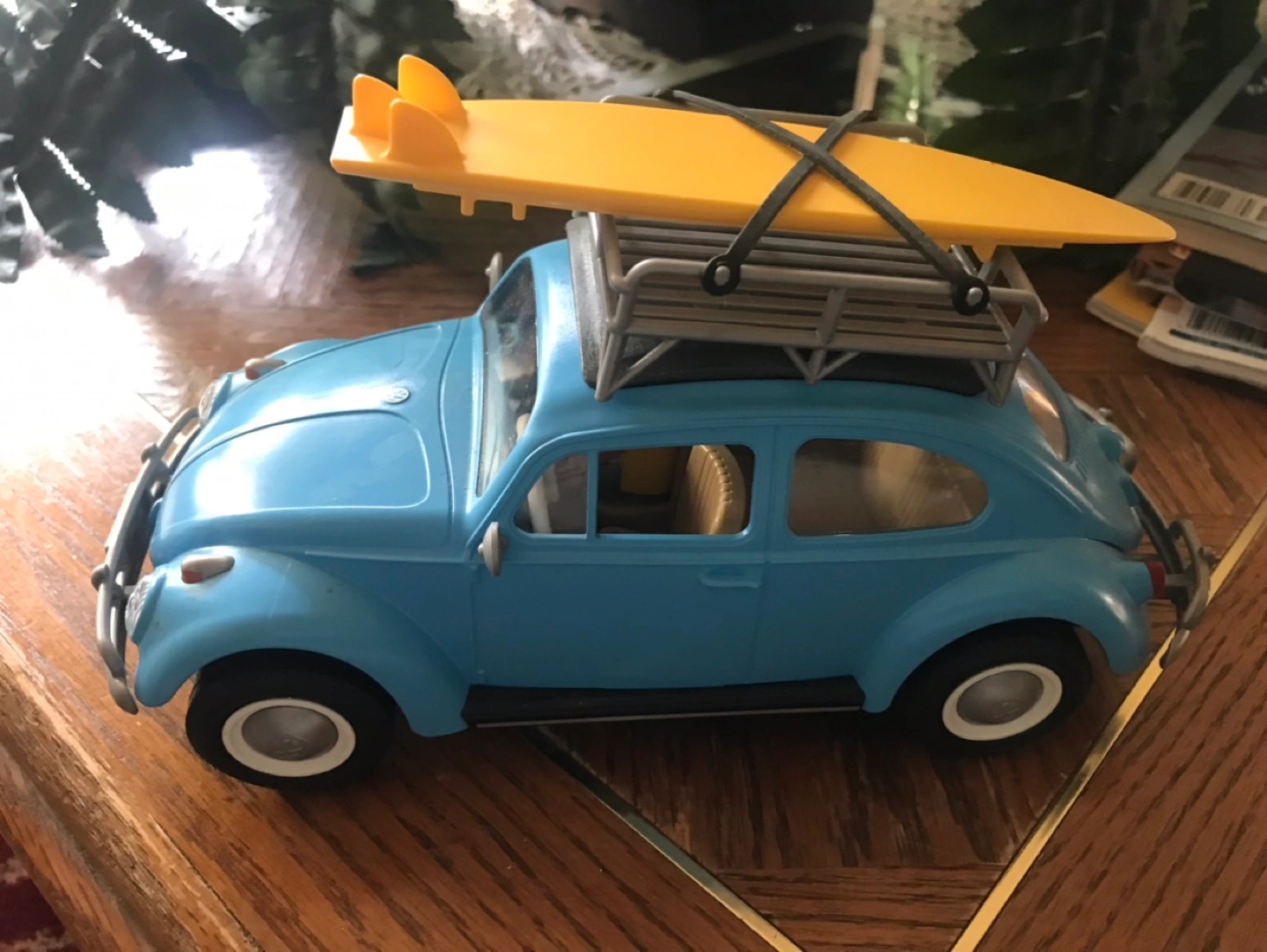 Selling a Playmobil Volkswagen Beetle toy car! It's in great shape and ready for a new home. It features a light blue body with a surfboard on top. Perfect for collectors or kids who love cars and Playmobil