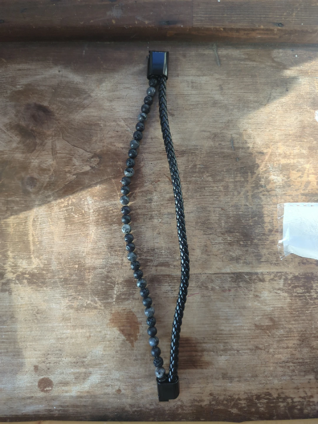 Selling a stylish bracelet featuring both a braided band and a beaded strand. The bracelet has black hardware.
