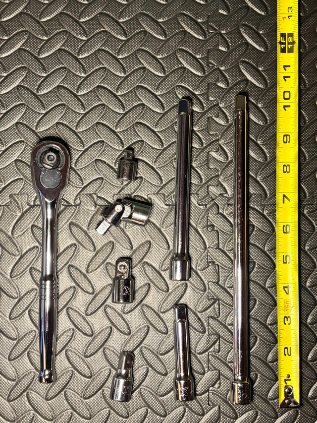 Never used. Includes 60-Tooth Mastercraft 3/8” ratchet, 4 extensions (1/2”, 3”, 6”, 10”), universal joint, 1/4” adapter, 1/2” adapter. Cleaned and lubricated. Pick up near Lougheed Town Centre. If the ad’s up, it’s still available