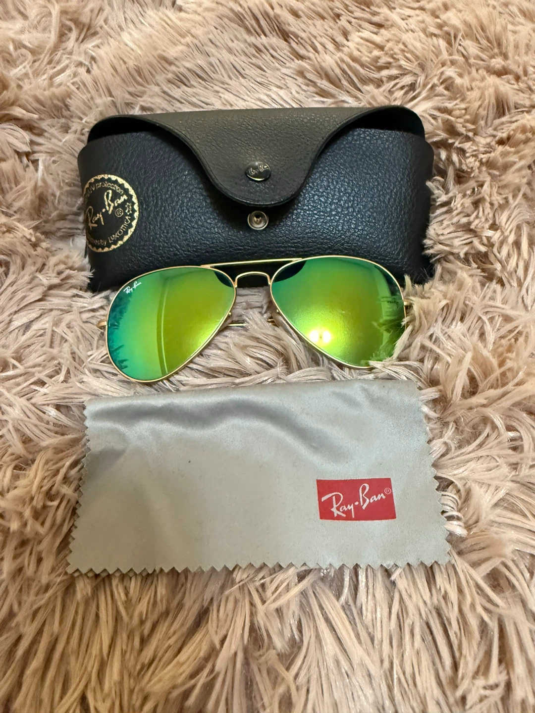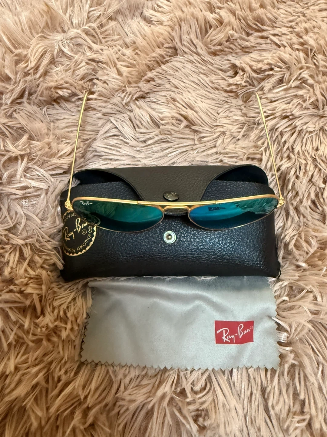 Selling a pair of Ray-Ban Aviator sunglasses. They come with the original case and cleaning cloth. Great condition and ready for a new owner!