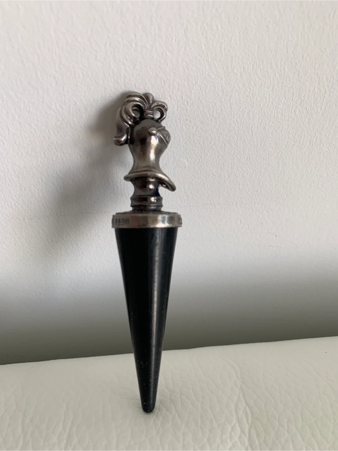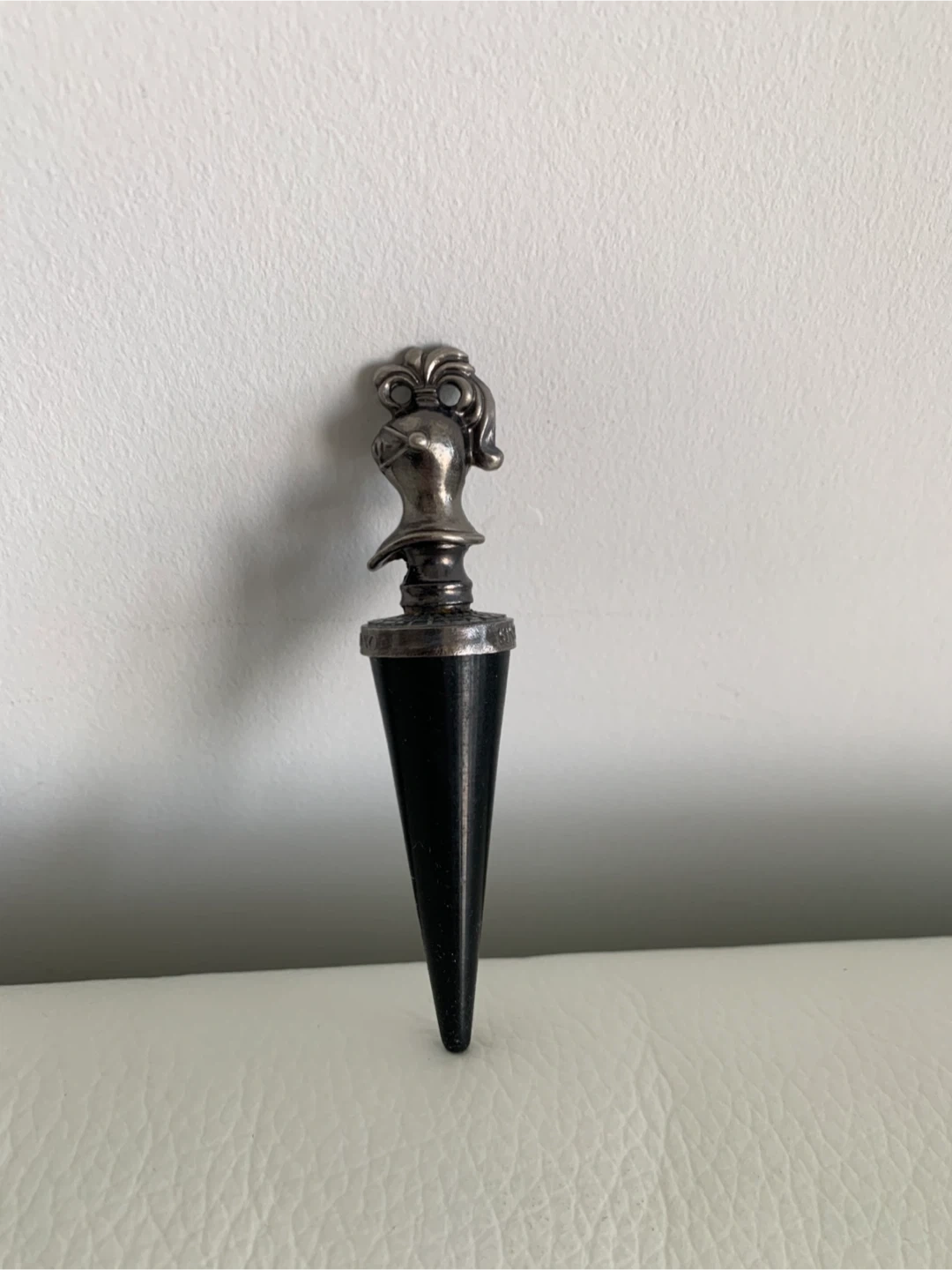 Selling an amazing Italian vintage wine stopper. It has a beautiful knight at its top w/ the inscriptions “Gabiano Since 1124” on it. Made of Pewter.