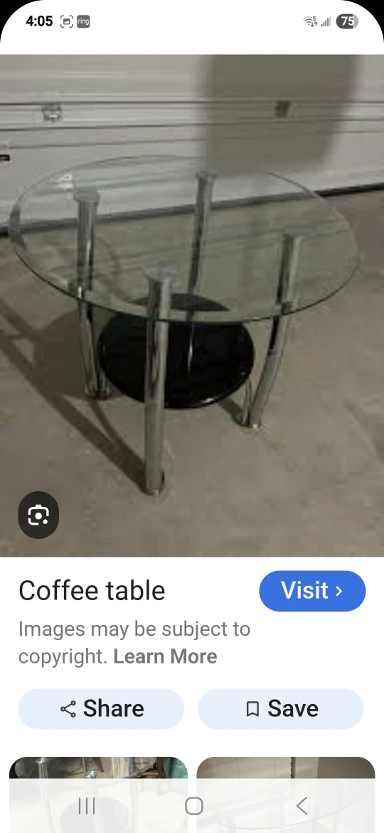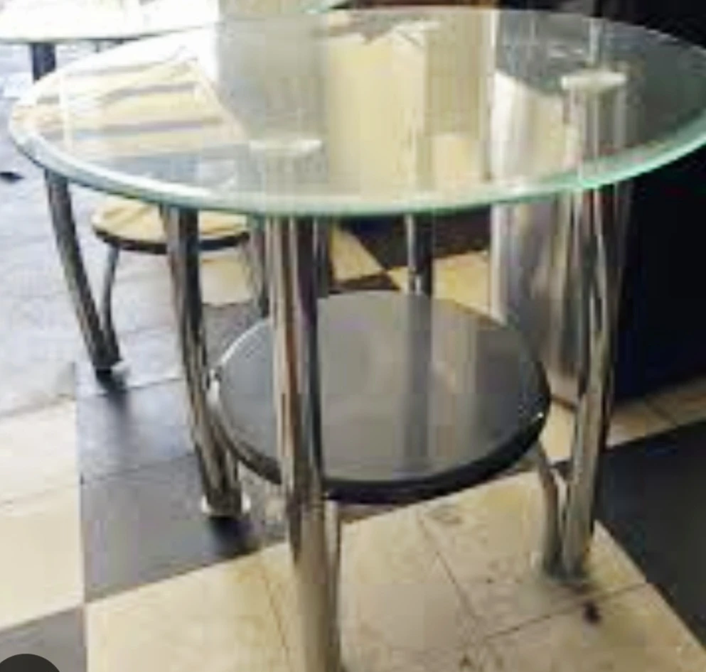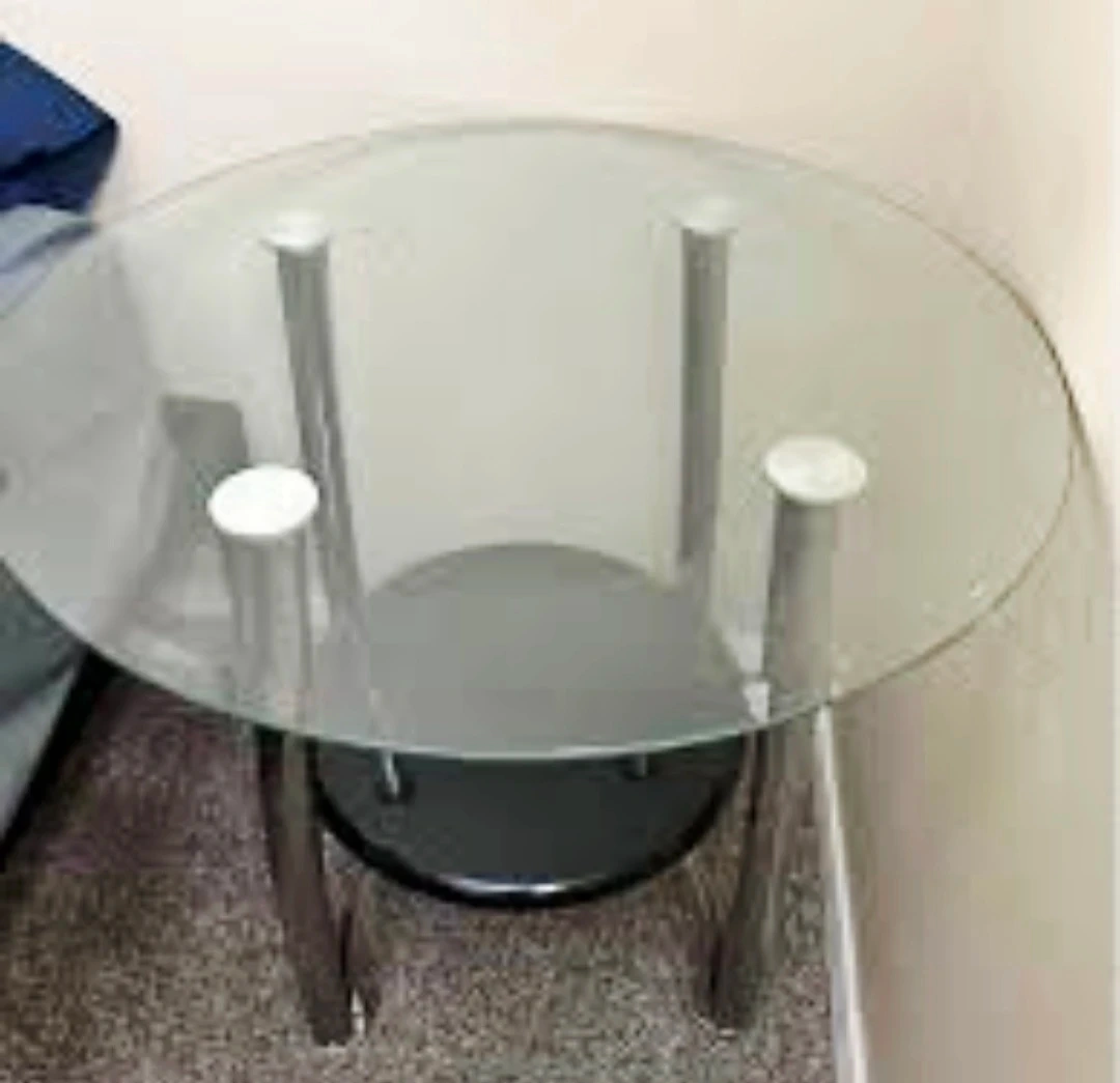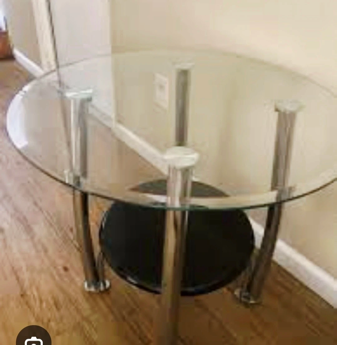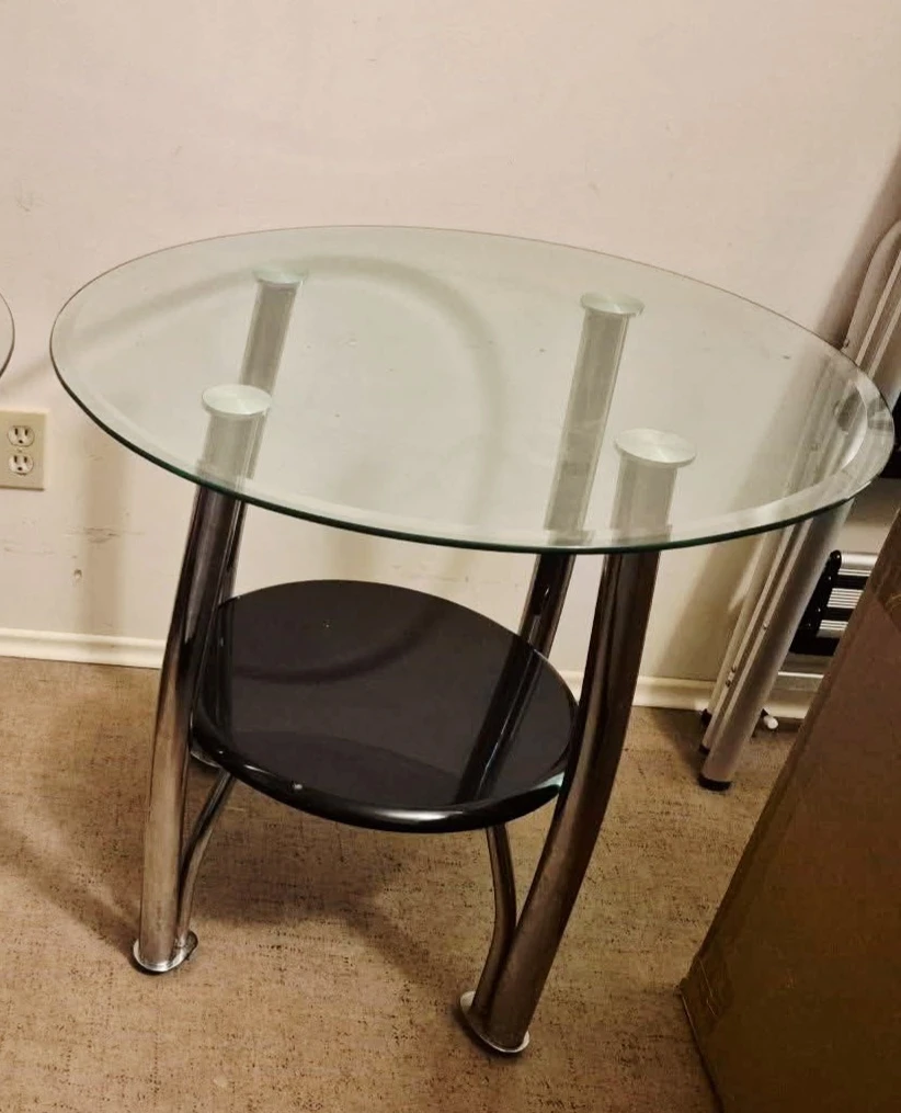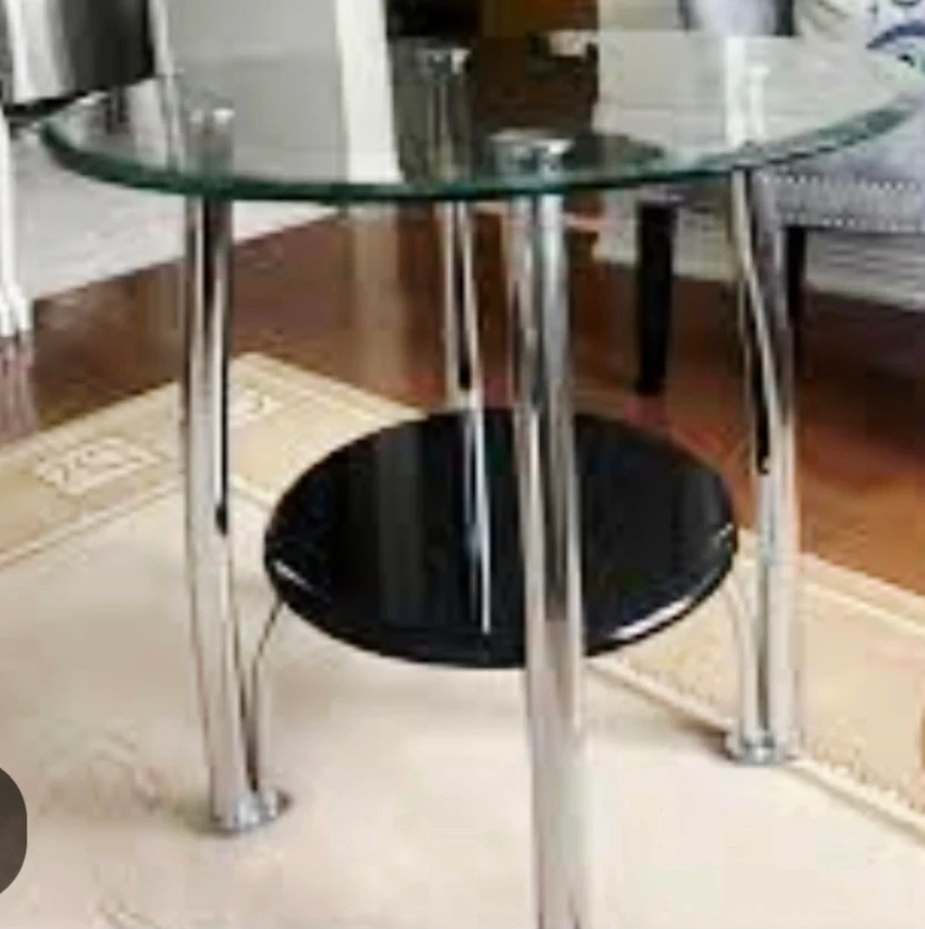 Selling a round side table with a glass top and a lower shelf. It has a sleek design with chrome legs and a black shelf. Perfect for a living room or bedroom!