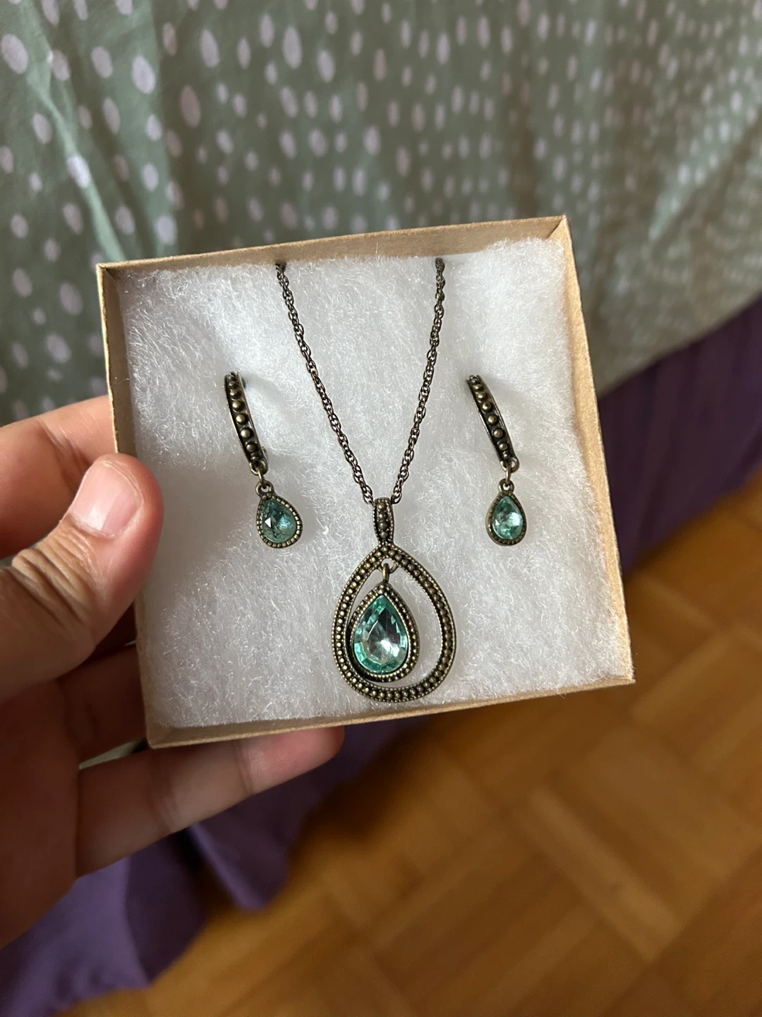 Selling a cute necklace and earring set! The set features a bronze tone metal with a teardrop shaped pendant and matching earrings. The stones are a lovely light blue colour. Perfect for adding a touch of vintage charm to any outfit. Can provide a book for gifting or storage.