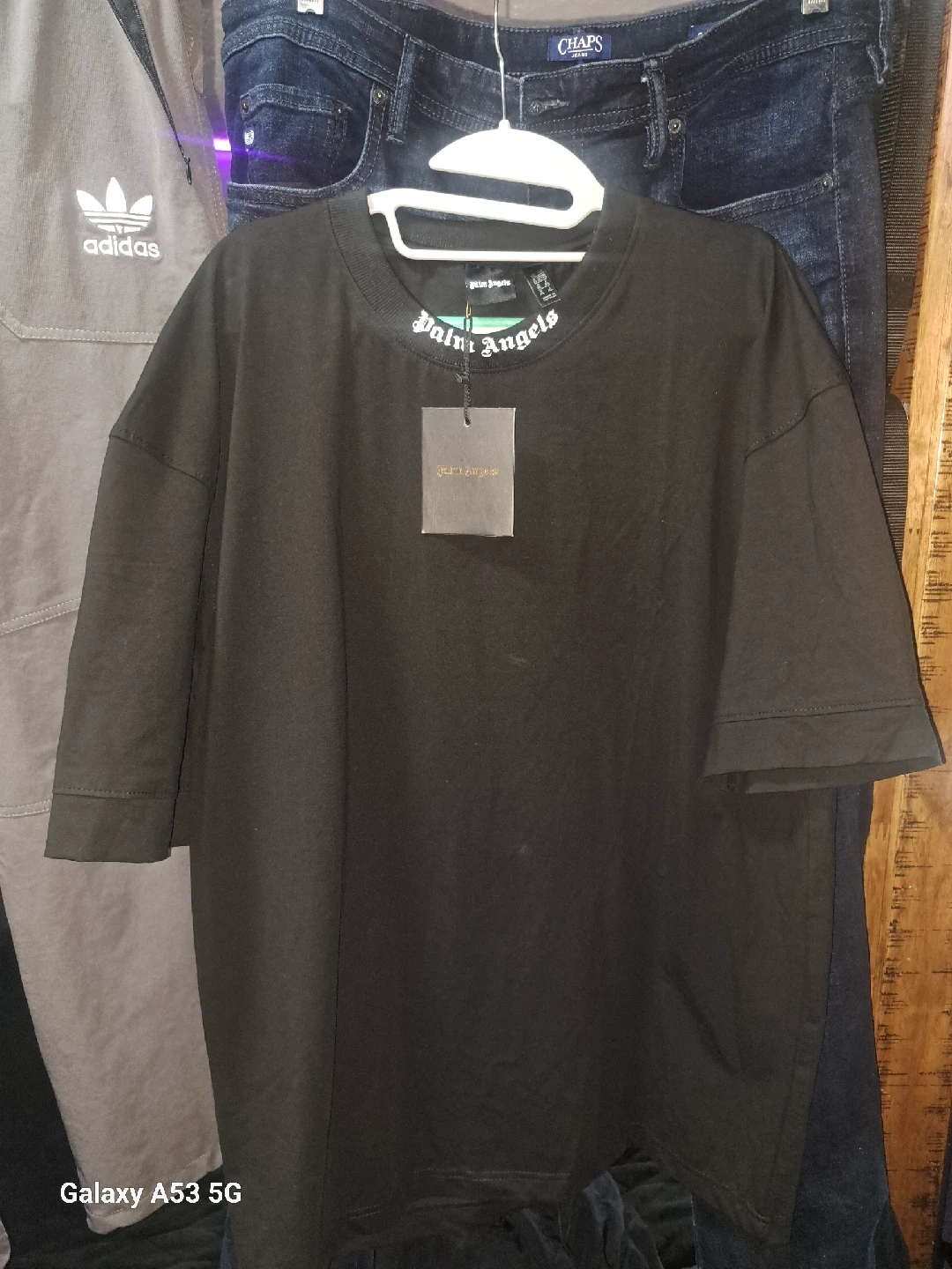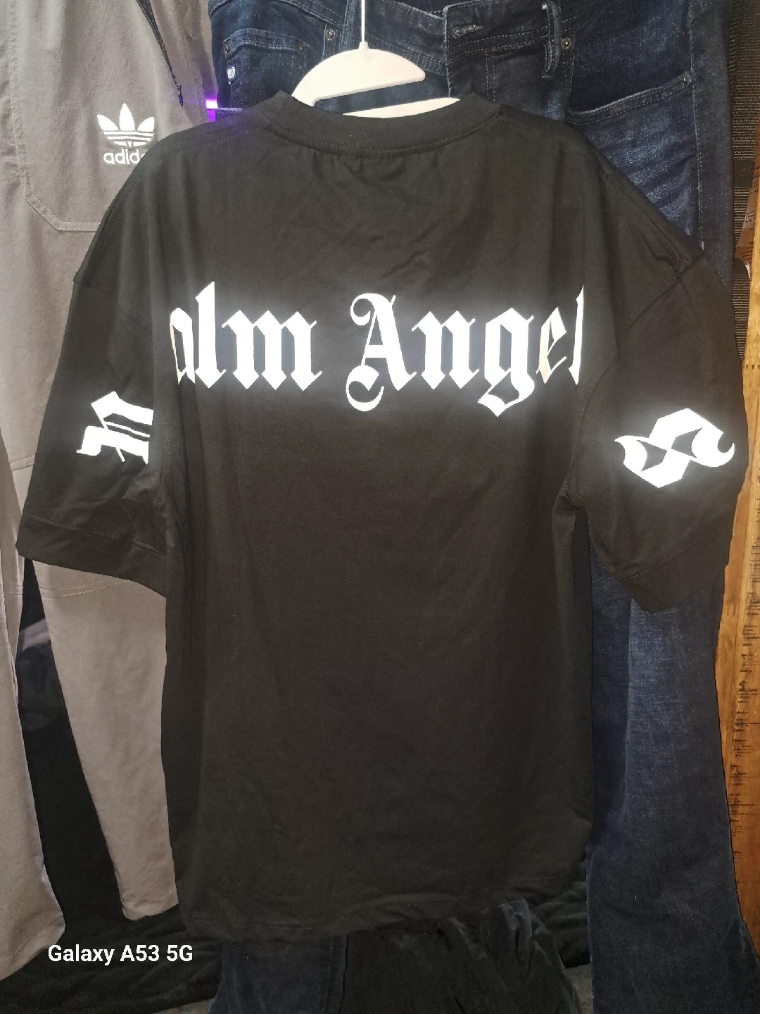 Selling a Palm Angels black t-shirt! It's in great condition and ready for a new home. The shirt features the Palm Angels logo in white on the back and on the collar in the front. A stylish addition to any wardrobe!