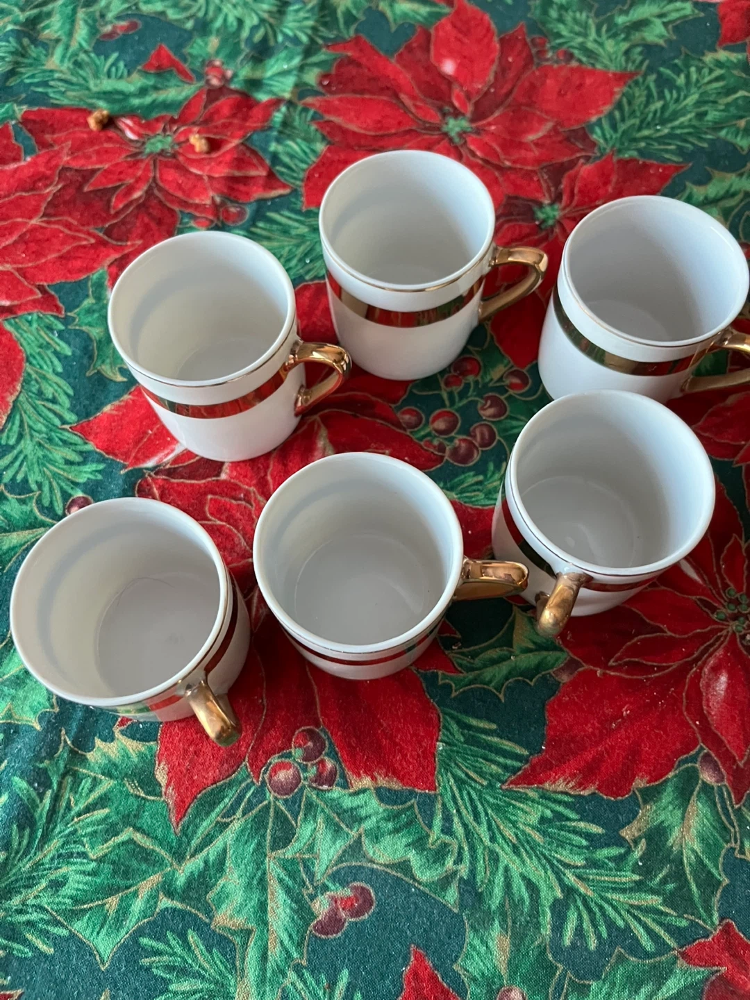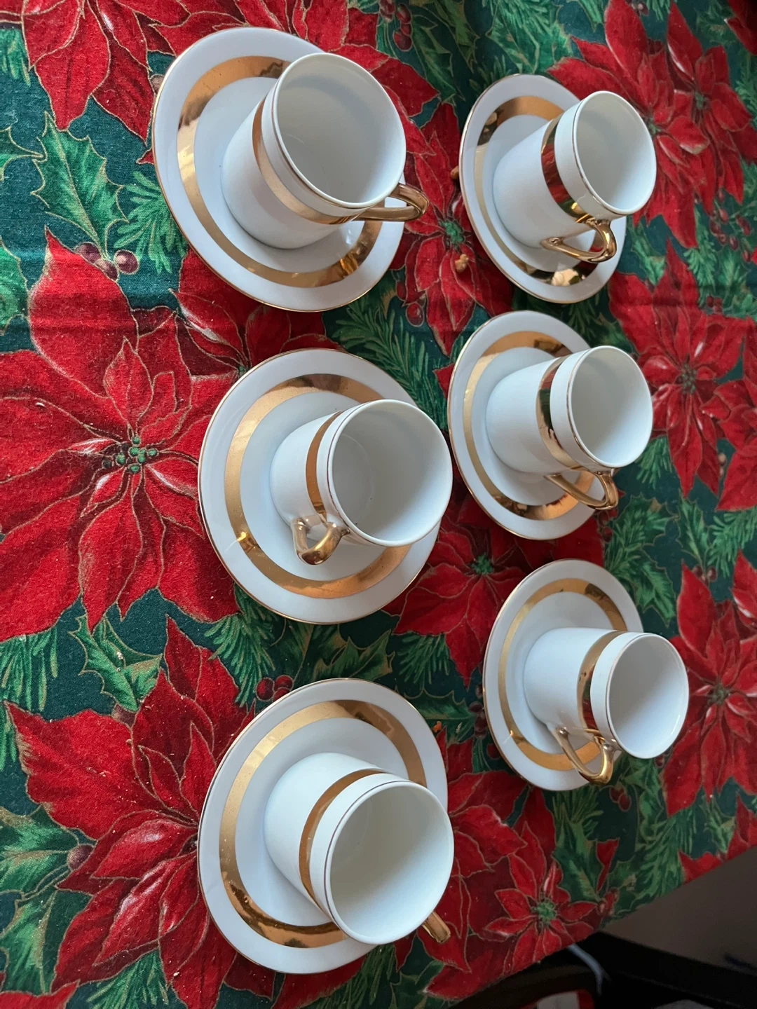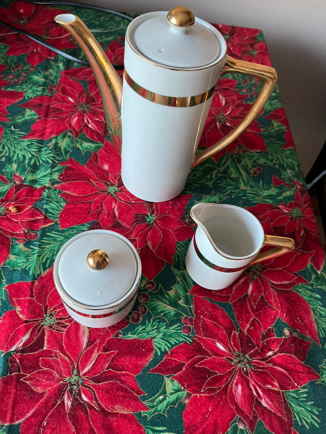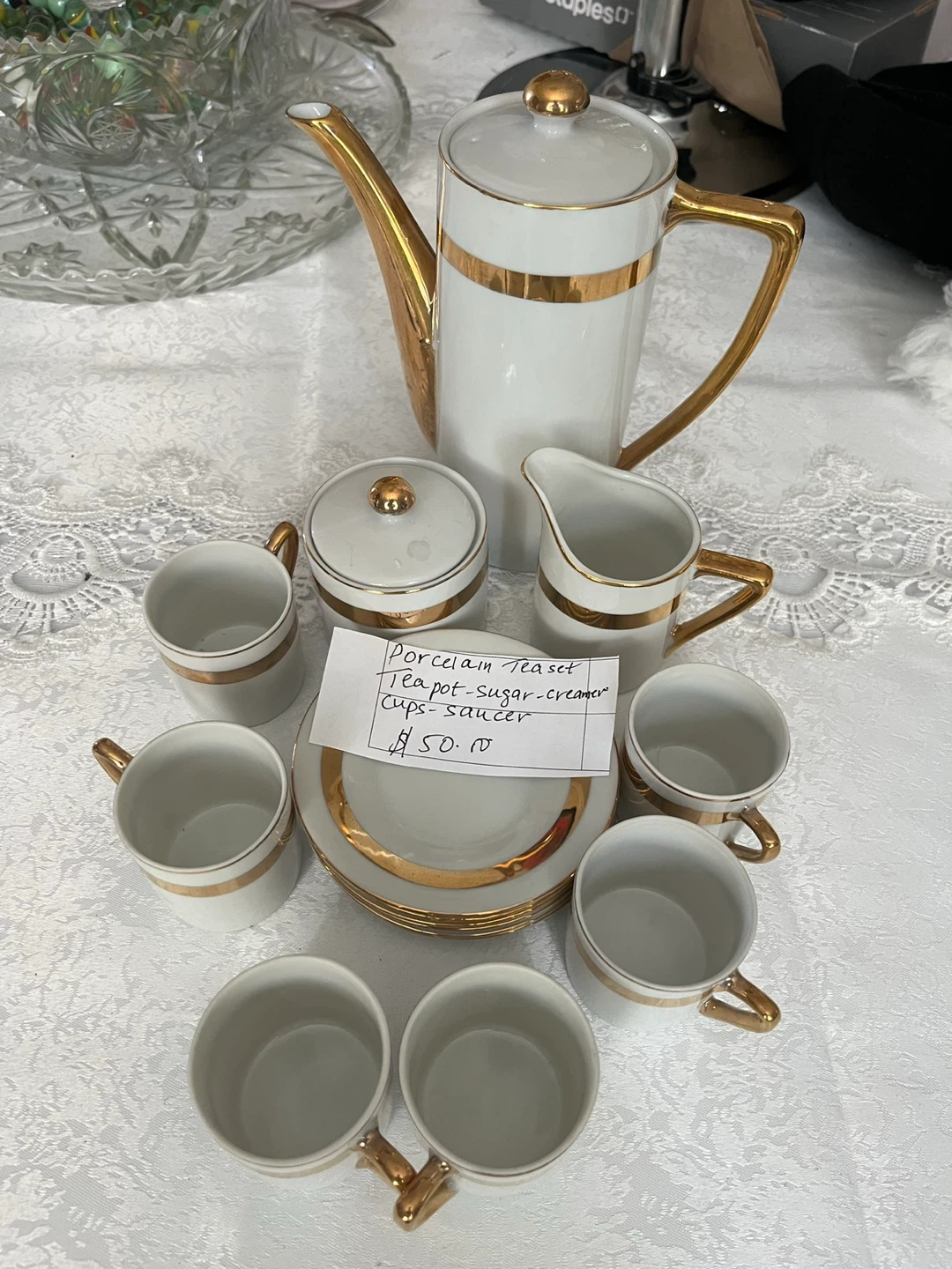Selling a lovely porcelain tea set! It includes a teapot, sugar bowl, creamer, cups, and saucers. The set has a classic design with gold trim, adding a touch of elegance to your tea time. Teapot capacity is 20ozs