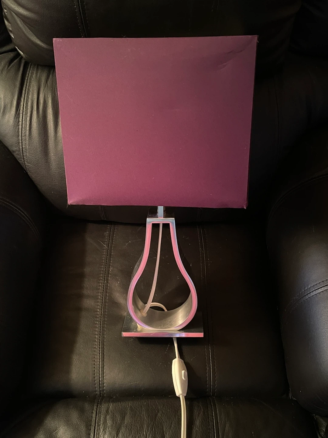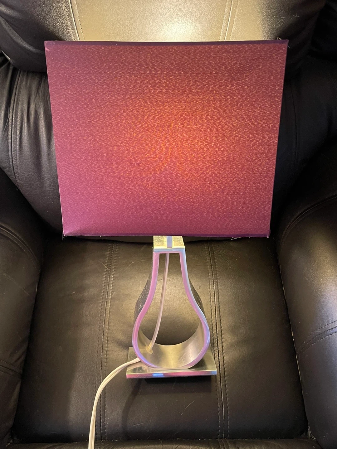Selling a table lamp with a lovely purple shade and metal base. Lamp is in good working condition but shade has some damage. On/off switch on cord. Includes bulb. Approximately 17 inches tall.